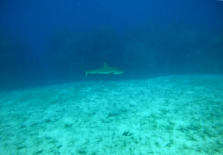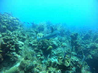 It’s probably a 30-minute ride to Half Moon Cay Wall, six miles south, to our second dive site. I enter the water after almost an hour of surface time. The max depth for this dive will be 65ft for 45 minutes. I hold the ace wrap on, stay a bit above the others, and watch the Caribbean Reef shark that follows our group but maintains its distance. There’s definitely more here that catches the eye, but that’s because red quickly turns to black at shallow depths and you lose half the color spectrum by 80 feet. I’m given permission after this dive to wear a glove because we’ll be out of the protected parks.