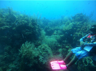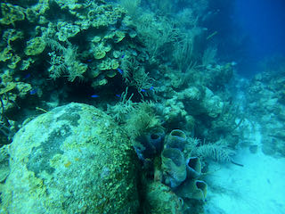 Caleb had looked up water temperatures before coming to the island so we knew which wetsuits to bring. Well, we brought too many as we learn that the Blue Hole will be 83 degrees today, instead of the advertised 67 degrees on the internet. I’ll still put on my white 3mm because I get cold easily, but we don’t need his 5mm or my 7mm for the rest of the trip. We are the first ones in the water, out of habit, but have to float between a military law enforcement boat (tied off to the dive boat) and the reef to wait for everyone to make the surface swim together.