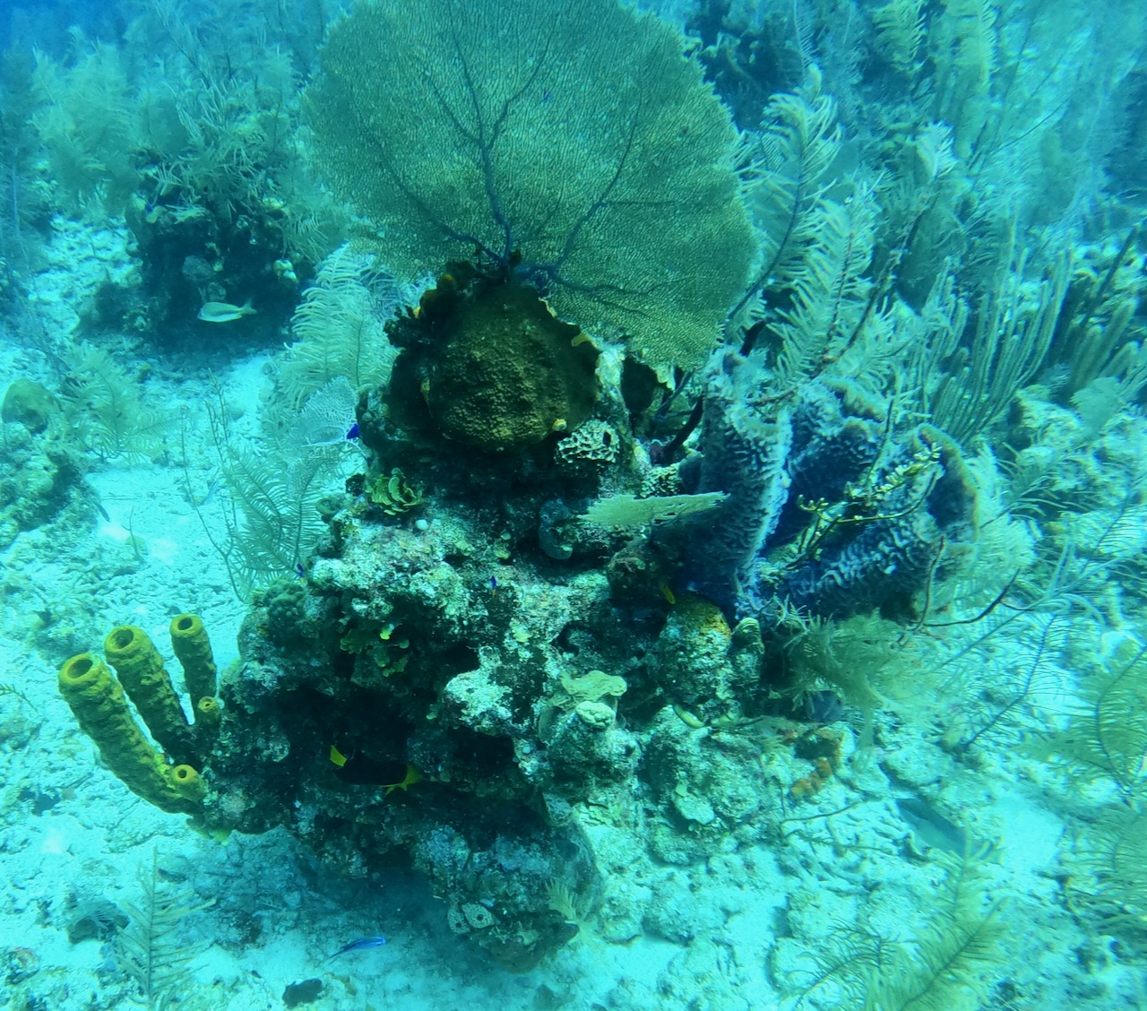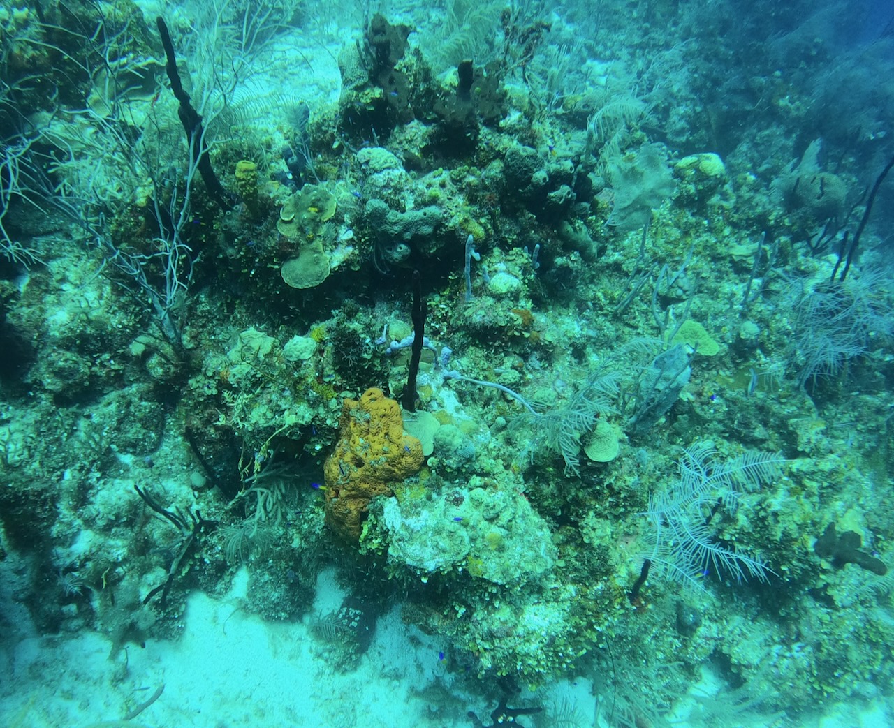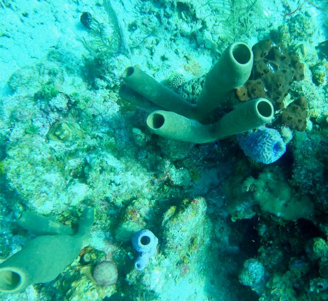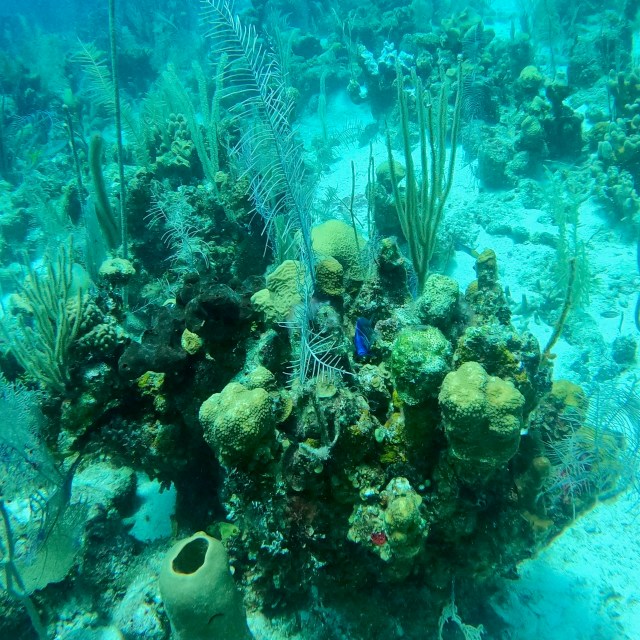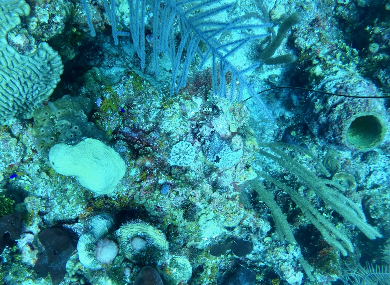 We have a small boat pick us up from the dock by Toast, the seaside grill, where we grabbed dinner last night before going back to the room at Mahogany Bay Resort. They will take us to a larger dock where we will be picked up at 730 for a three-tank dive day. We are grateful that Dolly and David, the couple who joined us in the Great Blue Hole dive, met the owners of this boat and extended the invite. The wife, Joan, holds the record for the least air used on a dive.