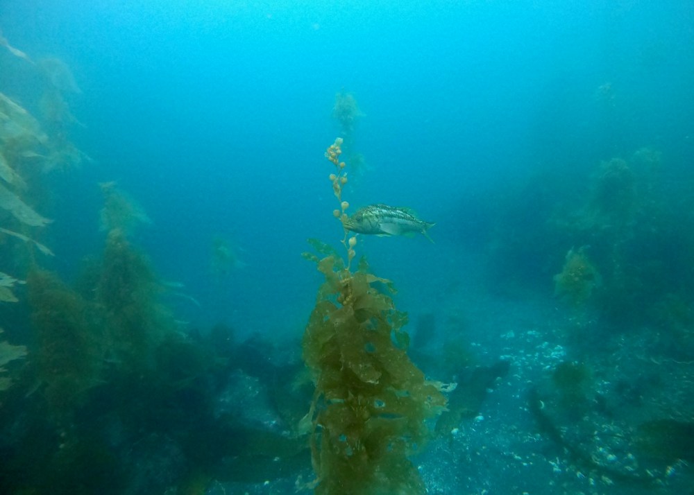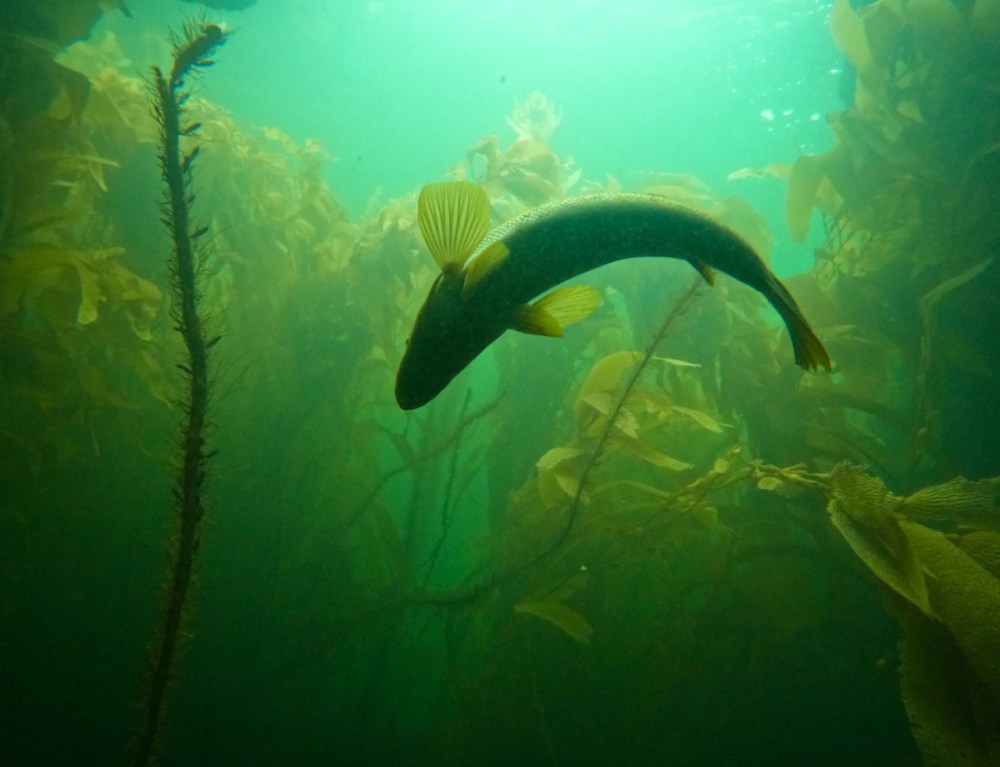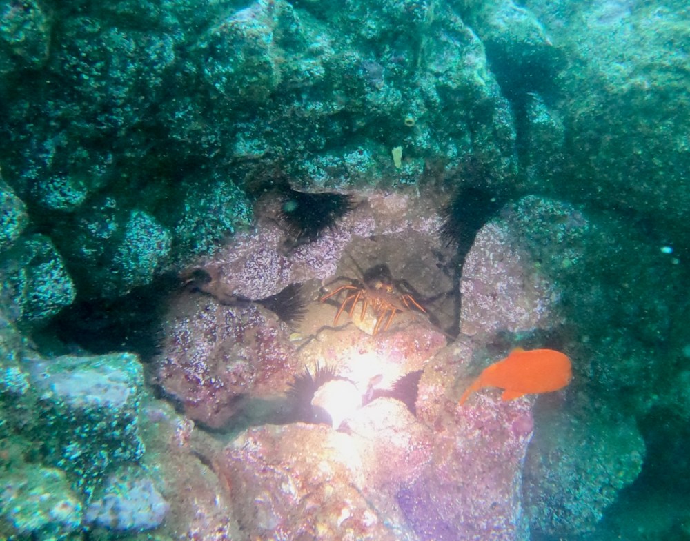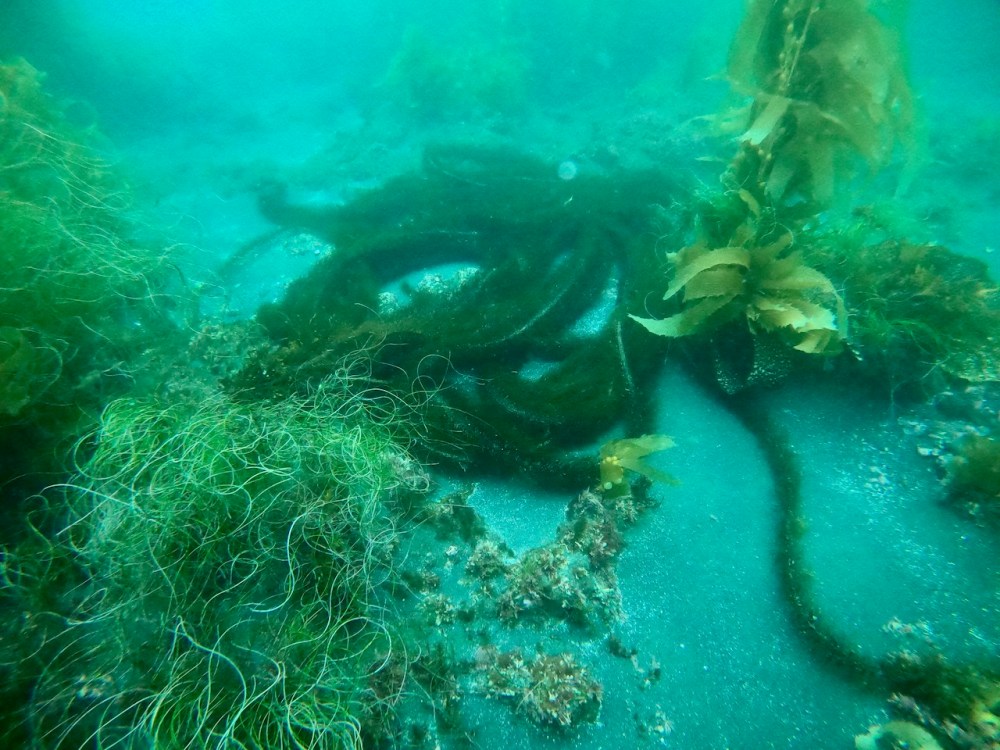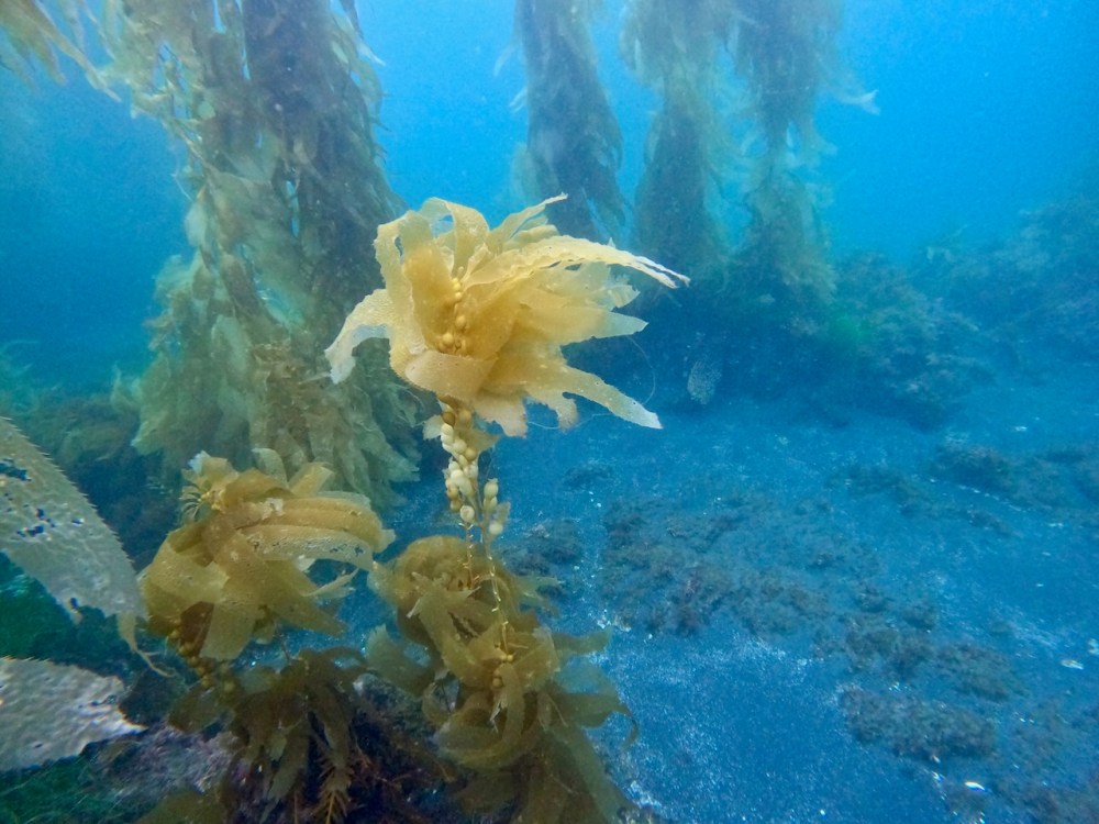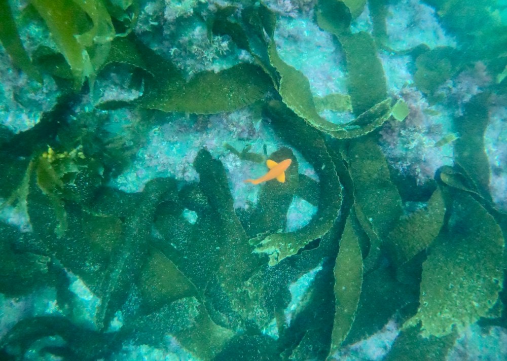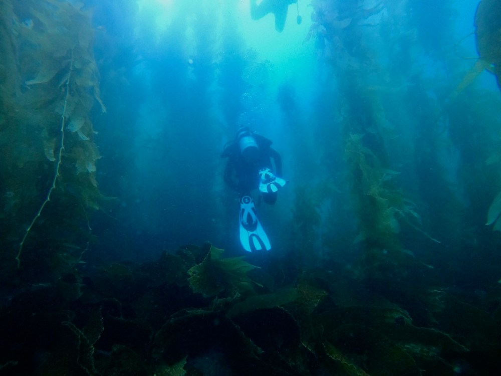 Our second dive site is Wizard’s Hat, named after a nearby rock feature, but could also be called kelp soup. We swim through an arch in hopes of seeing sharks but are just as happy with the acrobatic fish playing in this haven from the garden of entanglement. However, they don’t need the assistance of air tanks to keep them underwater and other tools that can easily get caught in the dense forest of what sea otters and spiny lobsters call salad. I try to navigate to a more swimmable area, but the only way is up and out of the water so Caleb can recover from being attacked by his food’s food.