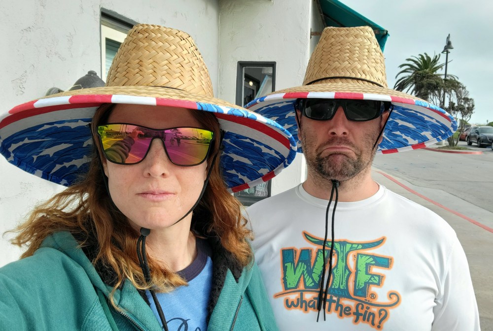 We return to Ventura Harbor at 4 p.m. and after loading our gear into the car walk over to the dive shop to look at finding another deal. I got my 7mm Henderson wetsuit on sale. We only notice what seems to be a suit for a giant but are told it’s more for circumference than height; either way, it’s too big for me so we will continue to wait as we’re not in a rush. Caleb still wants to find me a hat with a strap so it won’t blow off my head on a windy day while bike riding. We walk into Hats Unlimited with this purpose and to our surprise (not really) we leave with matching American flags with sharks as stars chinstrap sunhats.