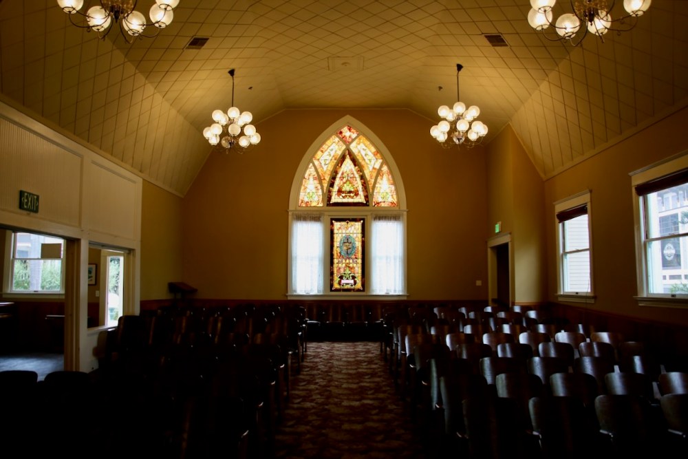 There’s still a church in use, the only wooden one surviving from the founding period of Oxnard that cost $3,176, to include the lot, in 1902. It is now called the Heritage Square Hall. Other buildings accommodate coffee, wine, and dentistry. The courtyard is being used to setup for a wedding reception. We enjoy the curved windows, stained glass, and the last original carving above a leaded window on the Scarlett House. I also watch the squirrels playing, the spider hanging, and a mural fading as we make our way back to the car.