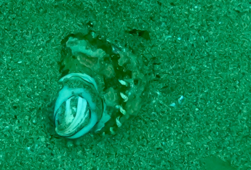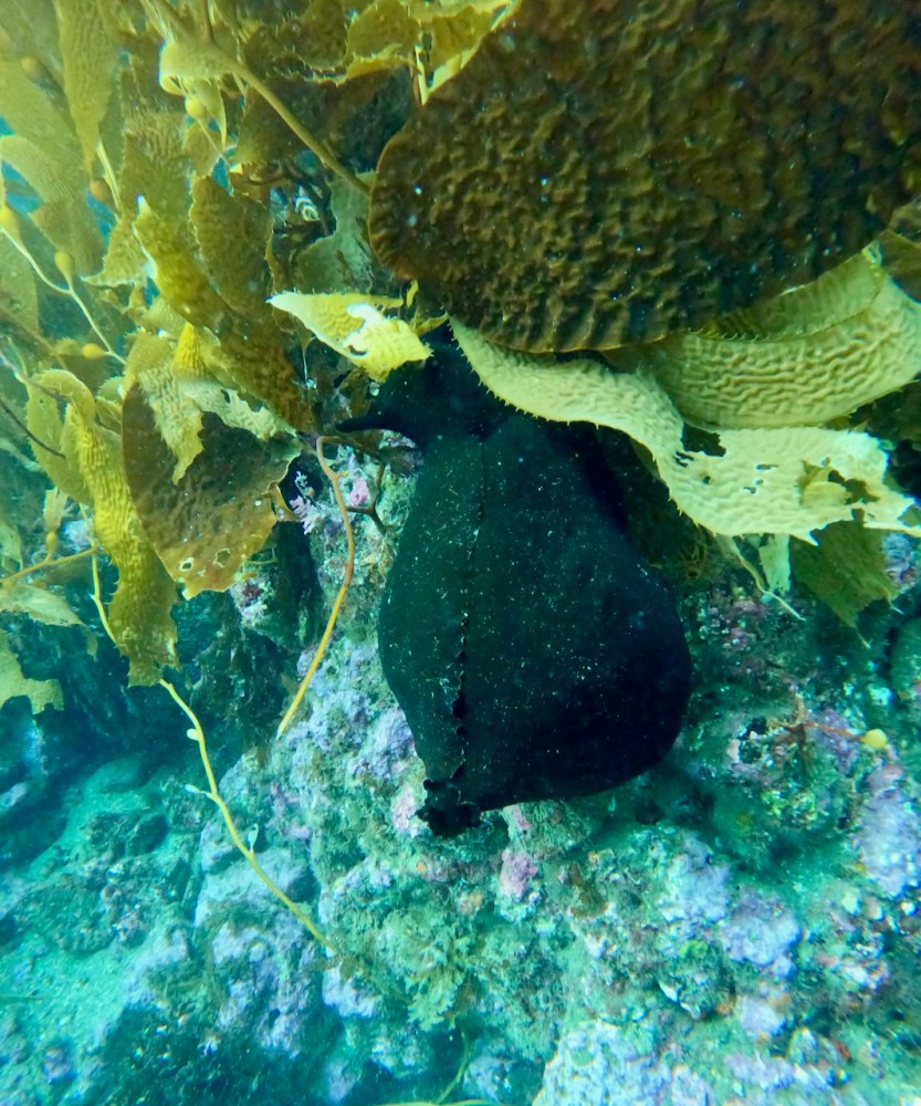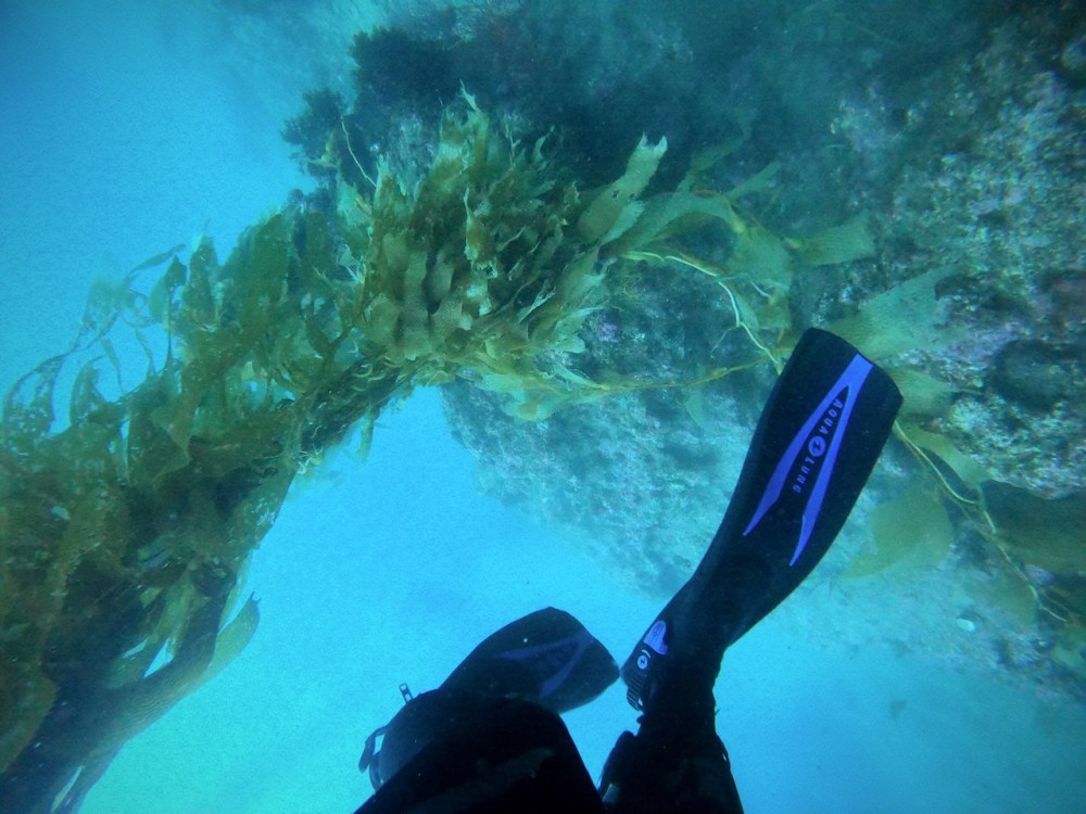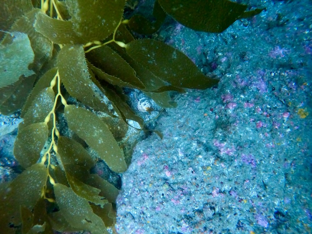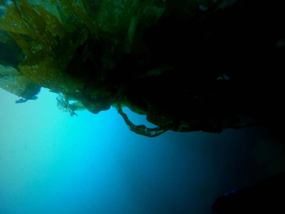 The third dive will introduce me to the second largest mollusk I have ever seen. The first was a cuttlefish in the class of cephalopod and this sea hare (so named because it’s closer to the size of a rabbit than a snail) is a gastropod, both between ten and thirty inches in length. The common garden snail reaches two to four inches when extended. I was surprised to watch the sea hare’s leaf-like body that looked like it was wrapped around an empty cantaloupe as it seemed to munch on the holdfast (that doesn’t absorb nutrients like roots) of some kelp.