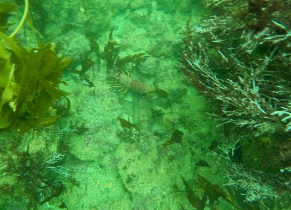 The surge is moving sand around which lowers the visibility of the dive, but makes the kelp seem more mysterious and magical. The lobster are easy to spot with their bright orange legs contrasting with the grey, purple, and green around them. As I struggle to make my way through this kelp alley, which would have felt like an eight-lane highway if the water were calmer, I notice a lobster taking advantage of his low center of gravity and extra appendages.