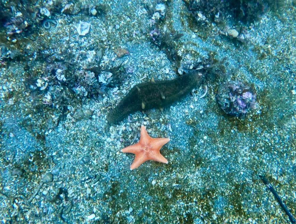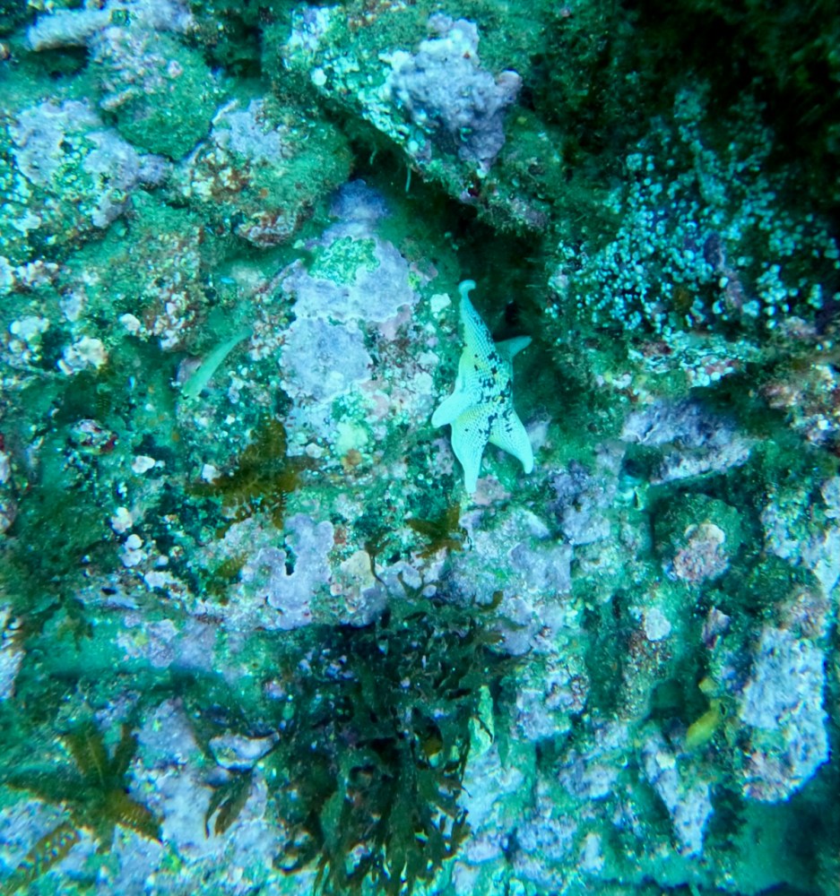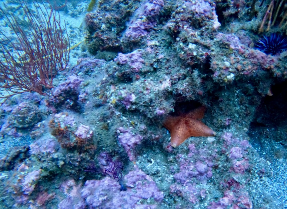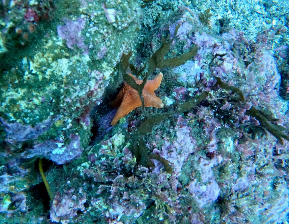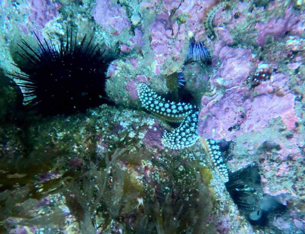 The second dive has a school of blacksmith damselfish, of which two-thirds seem to wear the cloak of invisibility or they’re out for fall break or were just eaten by larger fish, marine birds, or harbor seals. We also see Patiria miniata (bat star), a variety of nudibranch, camouflage and bright anemones, California sheephead and Oxyjulis californica (both in the wrasse family), sea cucumber, a grouper, possibly some living sand dollars, a couple of cowries and Trochus shells, and a beautiful black scorpionfish just to name a few.