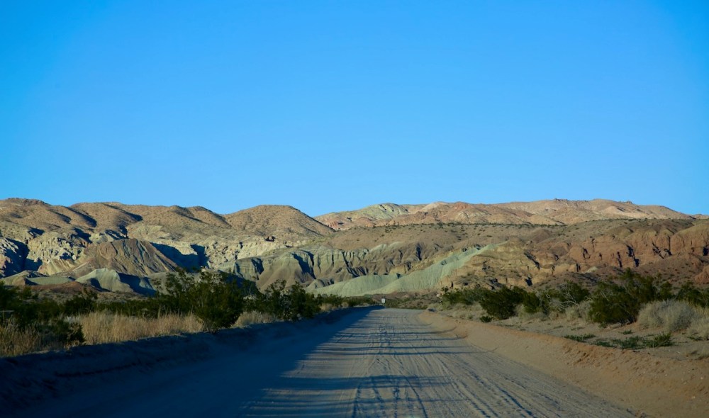 Remnants of this system are found along the trail and in Day Canyon. We’re here to take in the verdant views of the hills and the surrounding mountains before we head for Owl Canyon Campground where we will sleep among the stones and stars. We stop in Barstow and unprompted a woman pulls away from the gas pump with the hose still in her tank; a first for me to see live. We’ll get fuel for $4.08/gallon and then look for a toilet. There’s not one here, they’re out of order at Rite Aid, but 7-Eleven comes through for us.