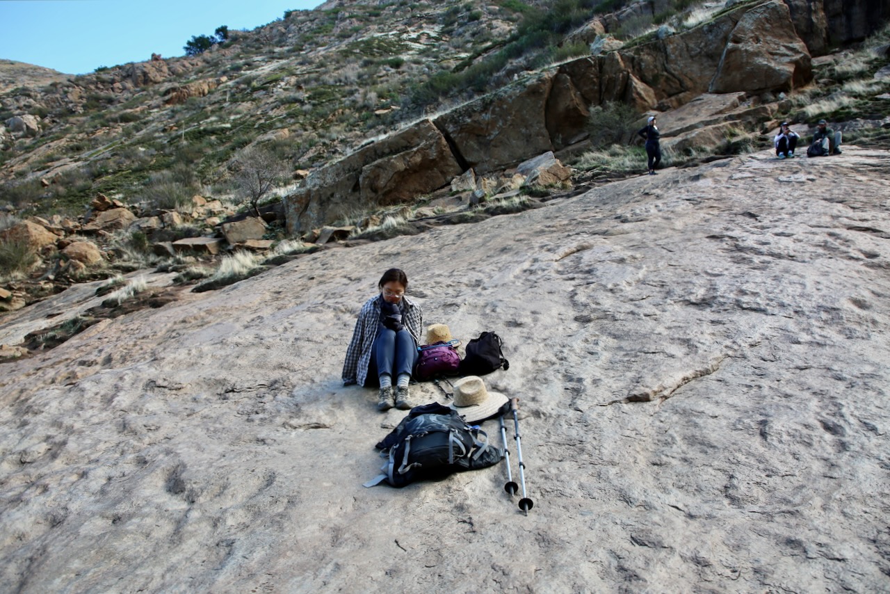 We feel the elevation change in our legs, we see the little mushrooms no bigger than a fingernail, we smell the dust and moist foliage, and hear the stream cascading down the rocks. As for taste, we sip on the flavored electrolyte-enhanced water from our CamelBaks. I step in a puddle and slip at the falls but incur no damage, ego or otherwise. The return hike offers even more to look at as we climb out of the canyon and into the heat.