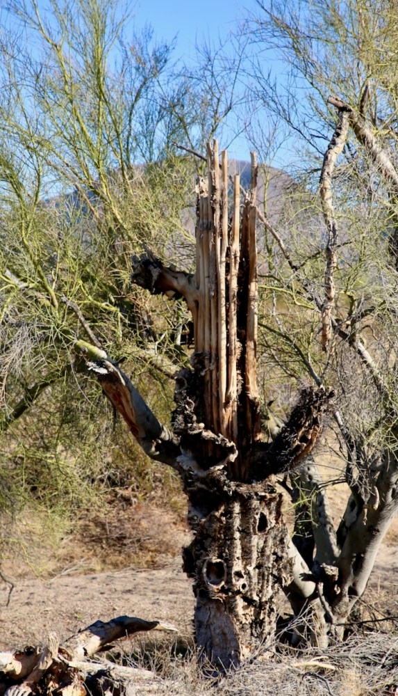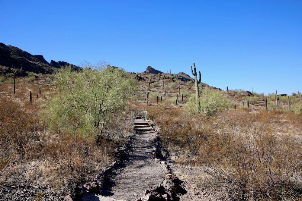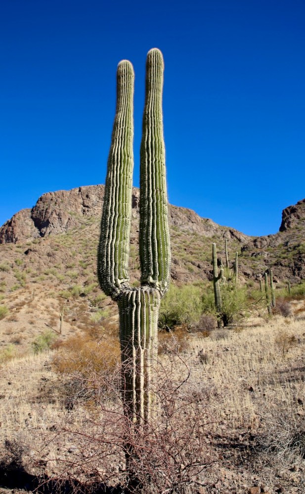 The sign tells us that in the 1840s, a bunch of Mormons met in Santa Fe and built wagon roads to San Diego that would later be used as a route for the railroad. The US made the necessary Gadsden Purchase after those men had suffered through patches of shrubbery in desolate deserts with loathsome water to complete the largest infantry march in history. We drive 11 miles to a parking area and walk in a wash that drifts along a drive-through hunting area – so we don’t stay long. We’re off to Picacho Peak State Park.