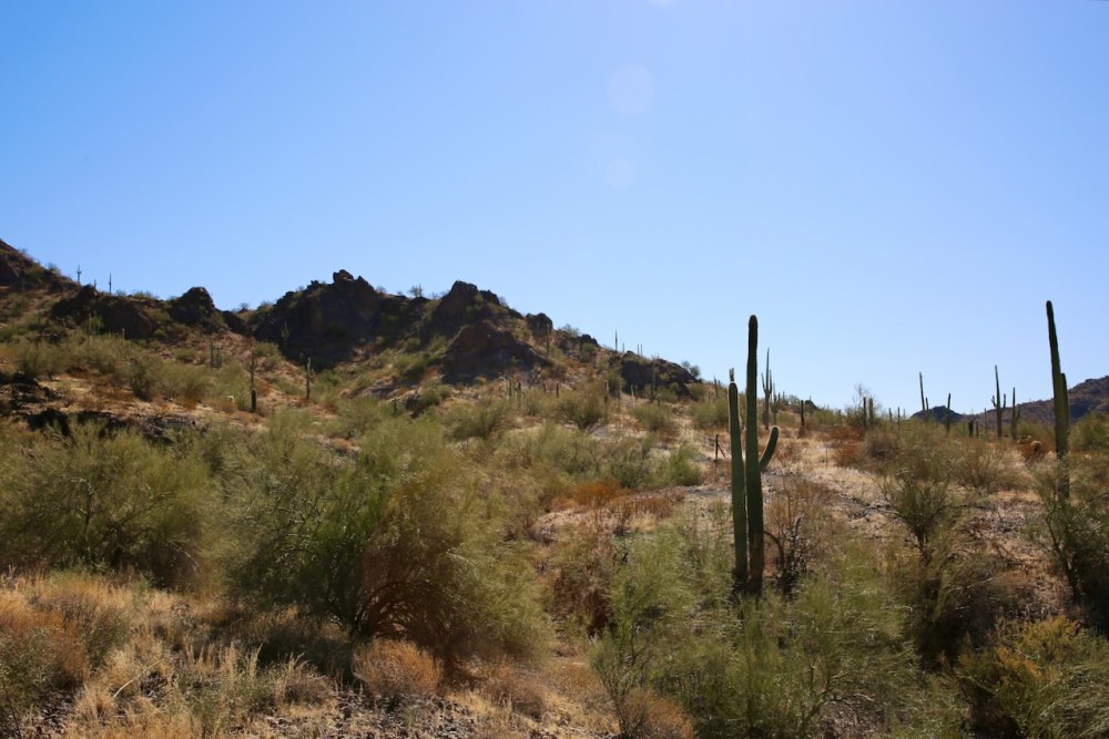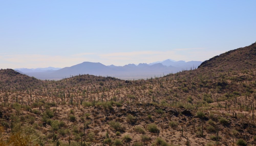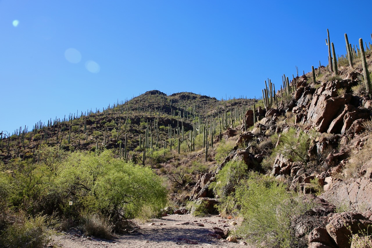 We pull up to the window, and a lady comes out to take our $7 and give us a map. I pull around the building, park, and go inside so we can discuss the hikes in the area. First on the list is Sunset Vista, with almost 900 feet of elevation difference. We’ll ascend a third of that before we turn around. We’re getting sweaty, forgot the water in the car, and it’s only 64*F. There’s a lot of steps through the field of saguaro in their different phases of life with their arms heavier than they look from storing water. We learn that they are slow growers and start holding out their arms at 75 years old until they die 100 years later.