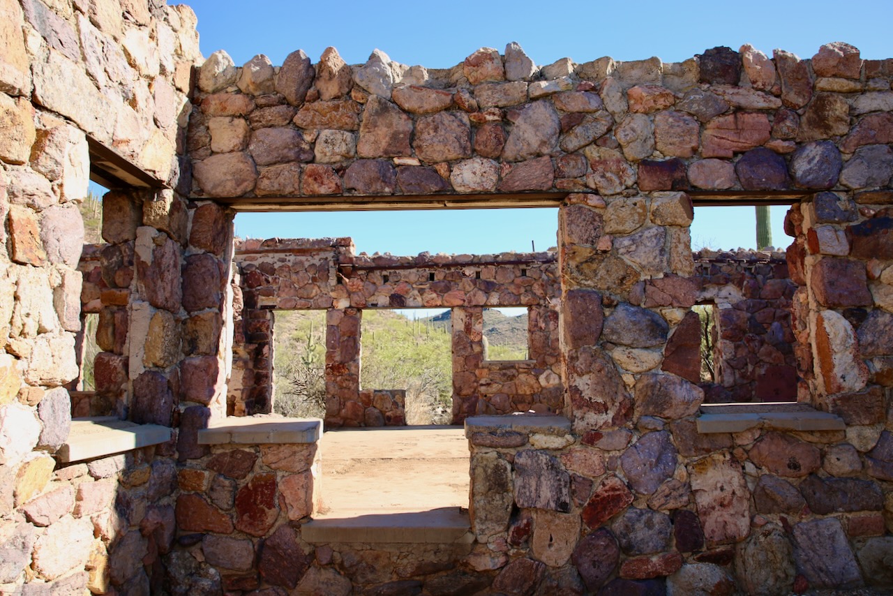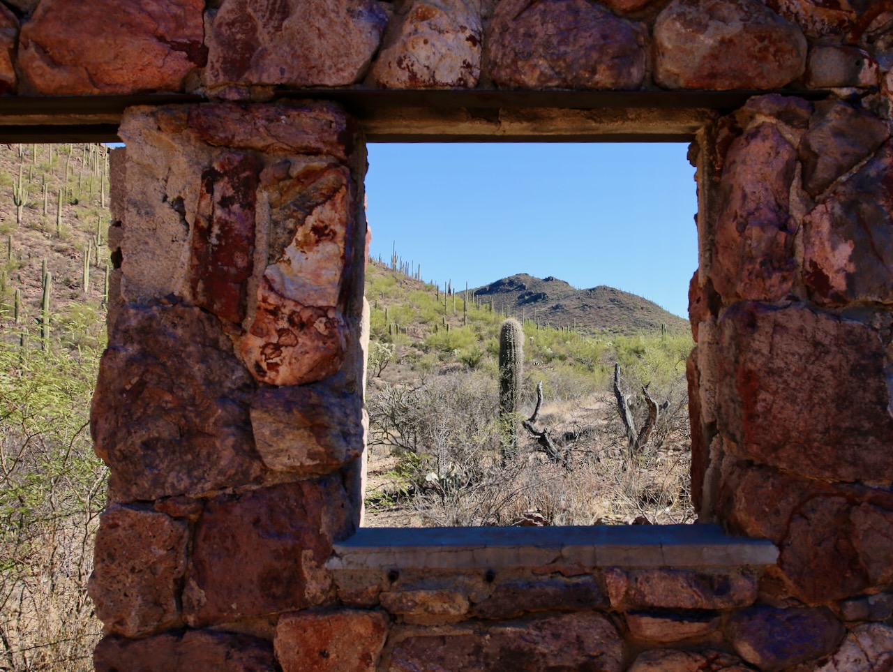 We find the David Yetman Trail by starting at the Camino de Oeste Trailhead that will take us through private property to the Bowen Stone House Ruins. On the map, this end of the park is near estates and a golf course, but while on the trail, we feel secluded in the desert surrounded by green cacti and bush, brown stones and dirt. The Homestead was built in the 1930s by a couple who had moved from Illinois for a change of climate. They eventually owned 2,000 acres but after their daughter was born in 1943 they moved to New York City and the property was purchased in 1983 and incorporated into Tucson Mountain Park.
