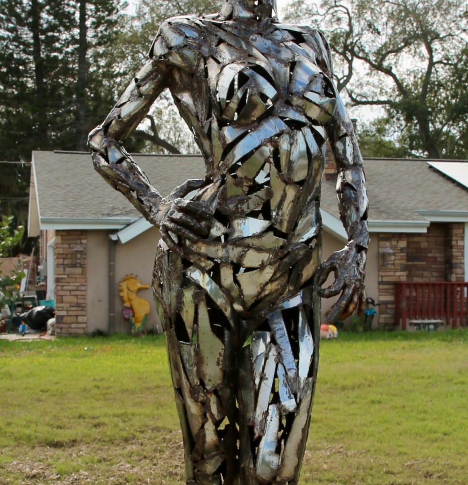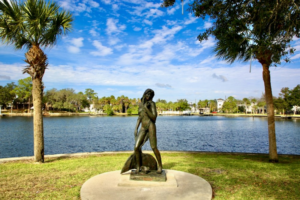 We see the manatee’s backs interrupting the slight ripples and wait for their snouts to break the surface. I’ll watch a squirrel, with a mouthful, climb to a high branch to eat its snack. We walk around Craig Park, so named in 1979 to honor two former mayors, after being named Coburn Park in 1935 after the man who sold the seven acres to the city. We find an Ama, Japanese for Woman of the Sea, mermaid statue. This one carries her tail with her while on land for her inevitable return to the ocean. Ama was created in 2014 by Amaryllis Bataille and is the 17th of a hundred similar statues around the world to raise awareness for protecting our seas.