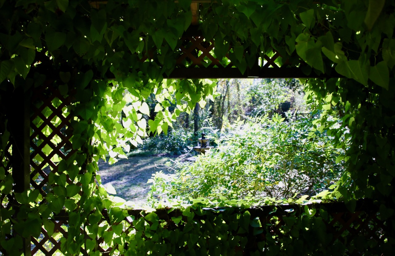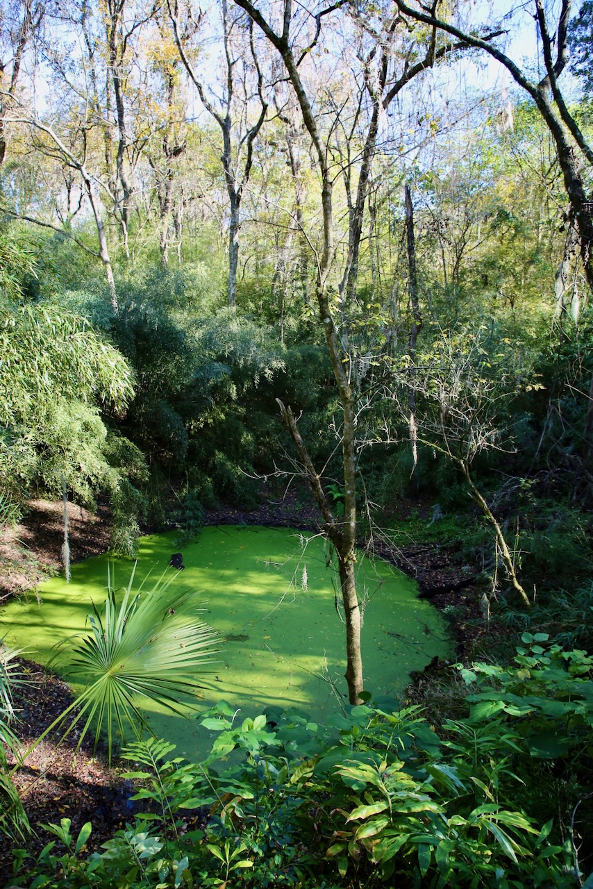 In the herb garden, we try a chocolate mint leaf that smells more cocoa and tastes very minty. The bamboo garden teaches us about clumping and running varieties, one leaving an impenetrable stand and the other more widely spaced creating an open thicket. What I was surprised to find out was that for ten months of the year, only the root system grows, and then for two months during shoot season, some bamboo can grow up to two inches an hour; faster than all other vascular plants. Then there’s the aroid, hummingbird, and rock gardens, and Lake Kanapaha which was formed by the collapse of underlying limestone.