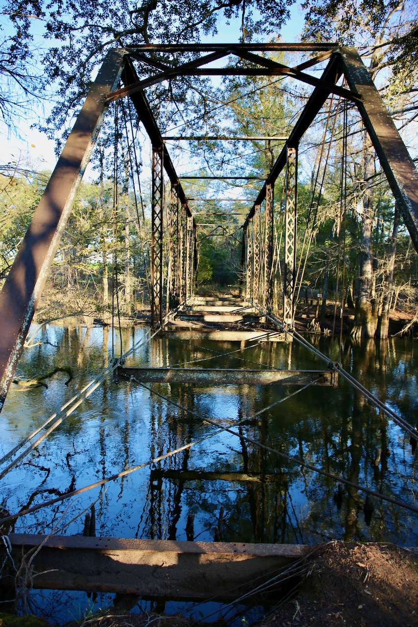 It’s believed this place is haunted by a wife in search of her husband who couldn’t be buried beside her for taking his own life. Perhaps people’s fear of this heartbroken woman explains why the signs look like a bear attacked them and was then shot at. The paper is wrinkled and sunburnt, also like an old woman. What’s left of the bridge is a memory of the advancements of bringing people ever closer to each other so we could trade language, food, crafts, and violence. The Battle of the Upper Chipola was fought here but is now where two curious lovers stand staring at the reflection of metal and wood on the water, part rippled, part smooth.