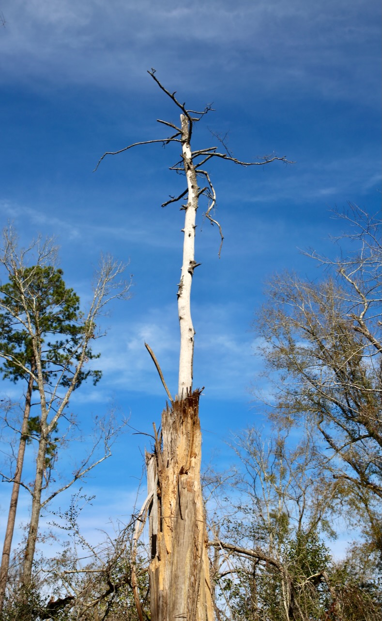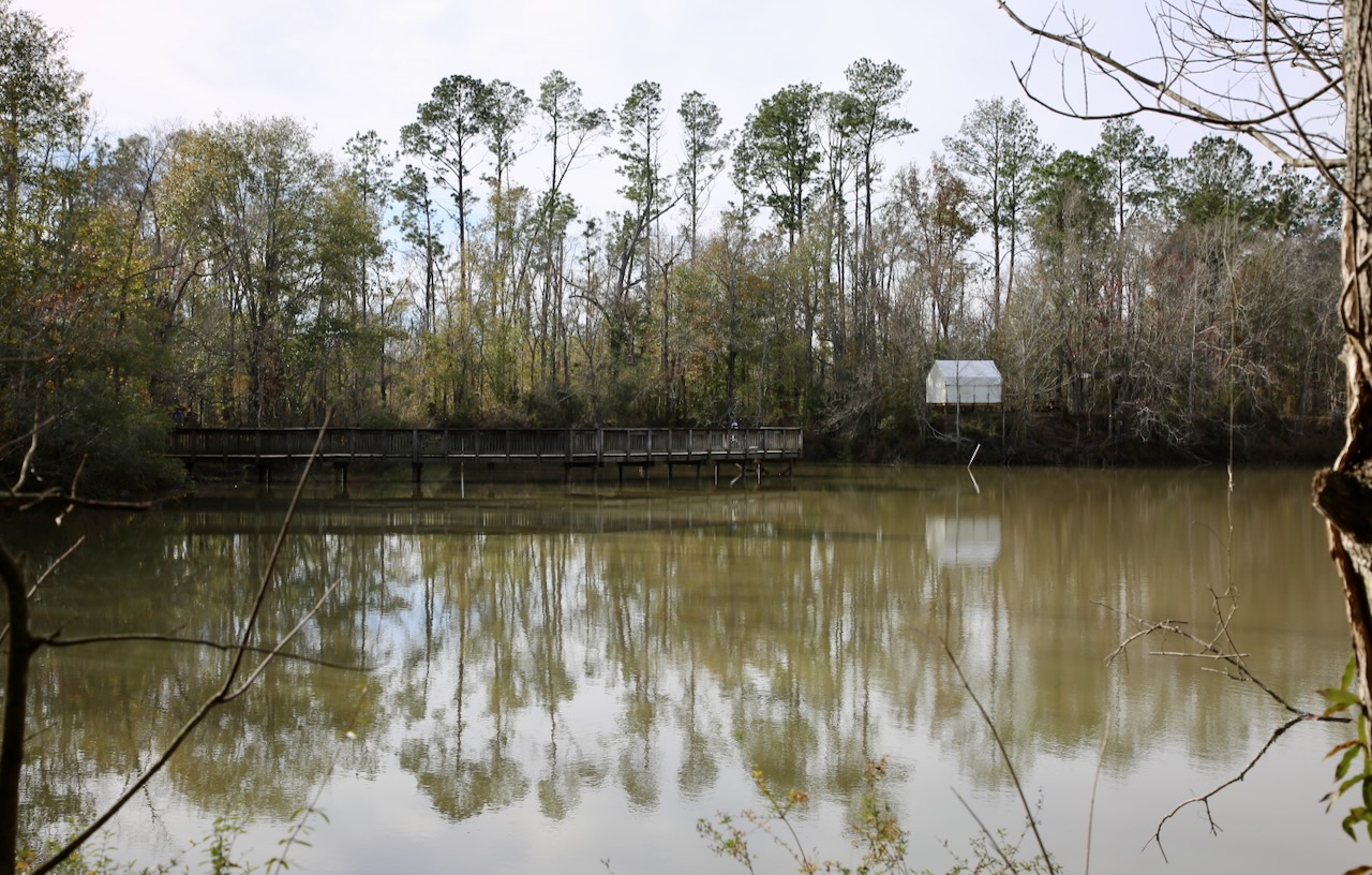 Our drive west seems to be broken up into roughly hour increments. Our next stop will be Tickfaw State Park, which also has three closed boardwalks. This narrows our hiking options down to Cut Thru Trail (between the nature center and picnic shelter, through the playground) and the Pine/Hardwood Trail with a mix of gravel, wooden bridges, and dirt paths. We meet JC at the river’s edge as he waits for one of his many hunting dogs to return, one from a mile away. We encounter one, tired on the trail, and have to backtrack towards the water until the dog hears JC’s voice and stops following us.