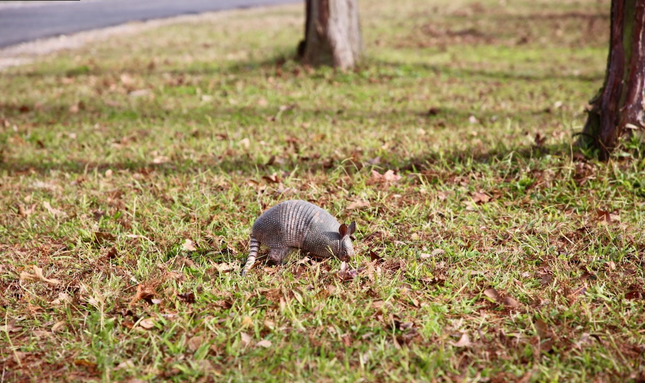 Also highlighted on the map of approved trails is the loop around the fishing pond located behind the RV campgrounds. Here we will see limpkins (a tropical wetland bird that specializes in eating apple snails – large freshwater parasite toters) in the trees, a gator attempting to hide under a one-inch thick branch in the water, and an armadillo rustling in the sun-coated grass of the afternoon. There’s a picture of me, as a preadolescent, after a visit to the local lake holding an armadillo that Mom caught just for that purpose before we let it go. I decided to leave this one in an unterrified state of being handled by a giant, even if just in the time it takes for a photo in the 90s.