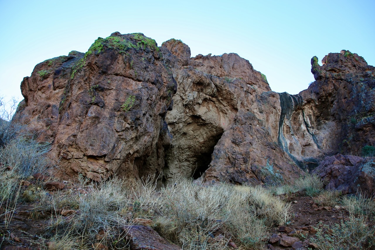 We opt for the sunnier Nature Walk Trail with a bird blind where we observe the empty feeders and watering hole before setting off on a path that allows us to look around. There are more purple cacti and yellow grasses to see before the fog reaches us at 4,800 ft. Our third hike of the morning will be the Aztec Caves Trail where we step our way over rocks and climb 544 ft towards a hole in the hill that provides relief from the sun and a view of the valley as the clouds seem to thicken and coat the mountain like a melty fondant icing.