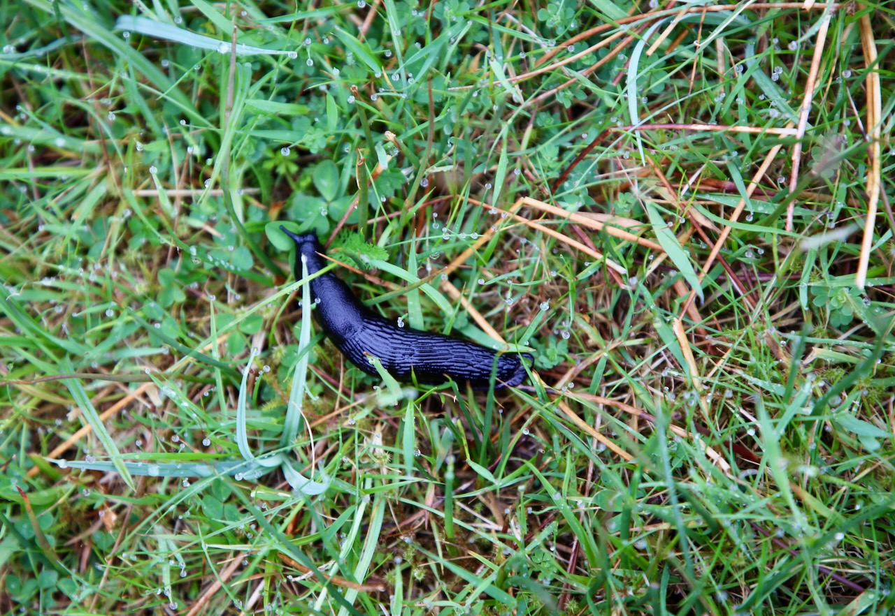 We stop again and notice a purple park sign with a peregrine falcon, the park’s symbol, on it, as these birds nest in the cliffs within the park. We’re not sure if it’s a trail marker or a park border but we see how many black slugs we can count hidden in the wet grass while being weary of the moss-covered rocks and the slippery mud as we explore up and down the hills and along an unnamed, to us, river. We see some deer that appear to be giving us attitude, but they’re just red deer still shedding their winter coats, giving their face that mean-mug appearance.