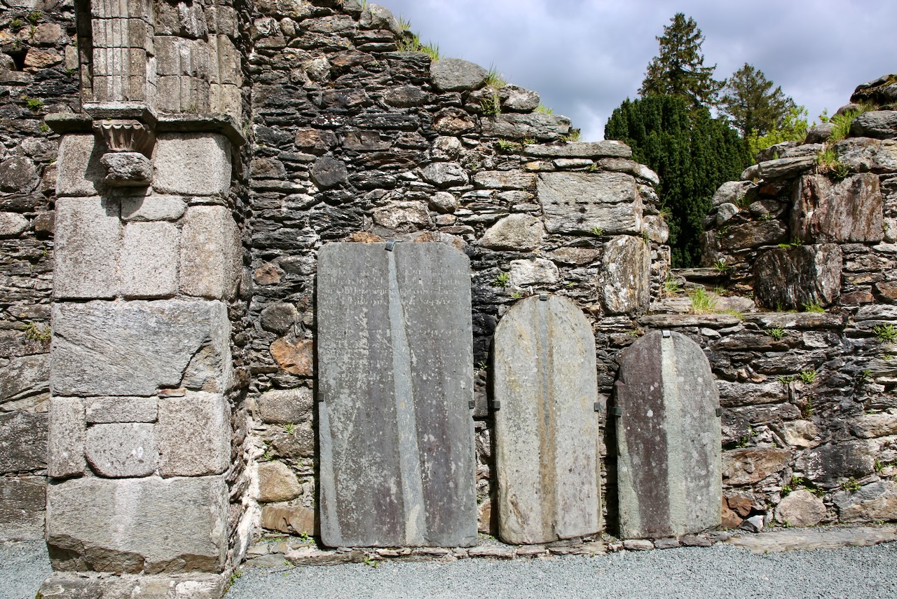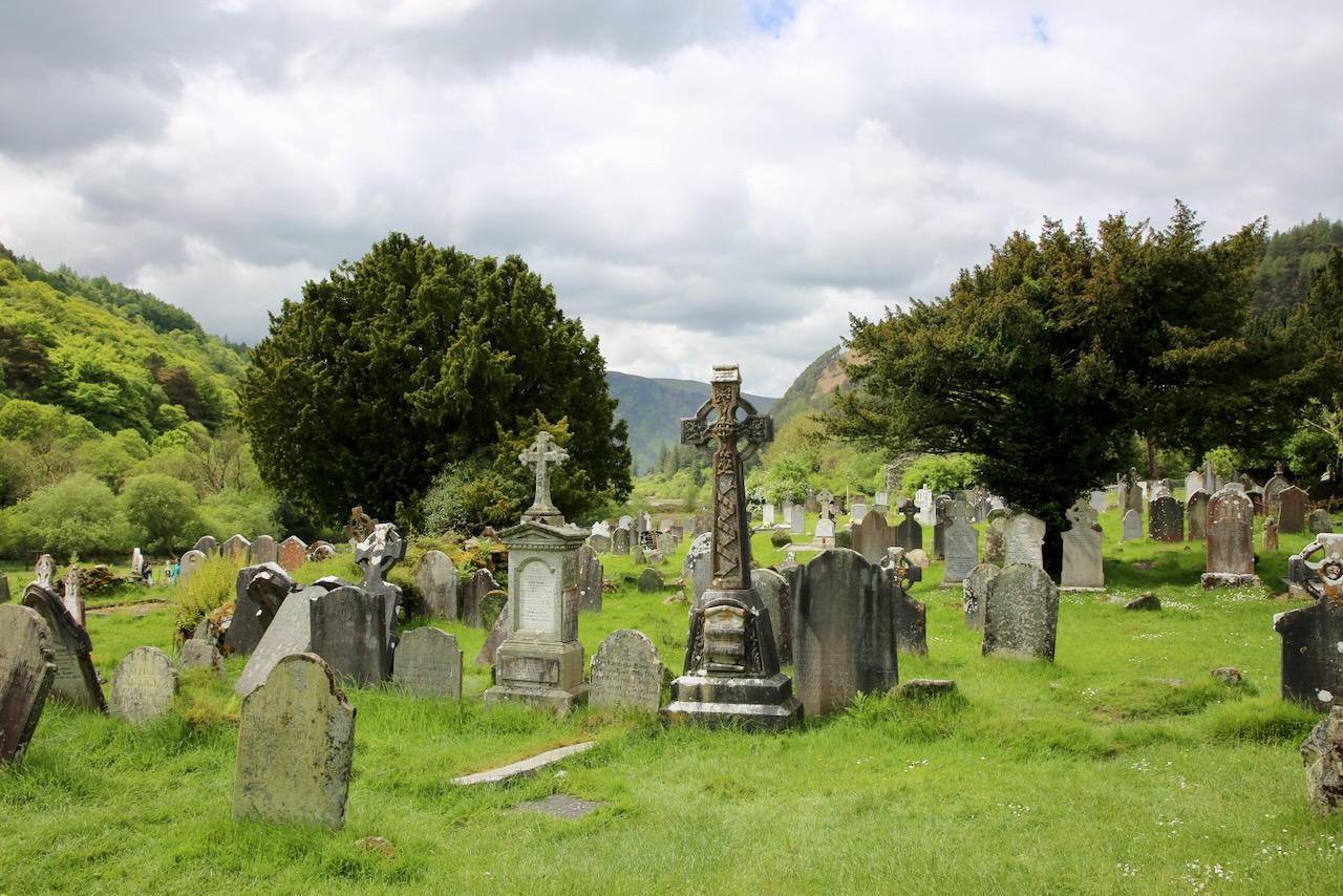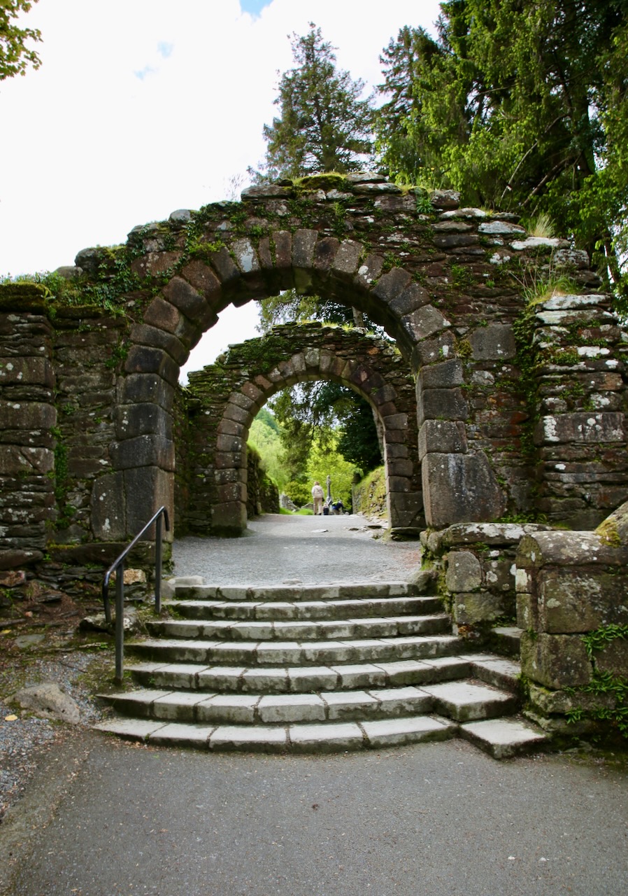 With renewed energy, we walk through the cemetery and around other buildings of the old monastery founded by St. Kevin in the 6th century. This place flourished even through plundering raids lasting until the early 17th century. This double gateway, which had a second story, is the last of its kind and is believed to have been built between 900 and 1200 AD. Some of the tombstones are dated 1793, one possibly as early as 1549, and others are more recent as members join the family plot or perhaps friends went in on a group grave; talk about best friends forever.