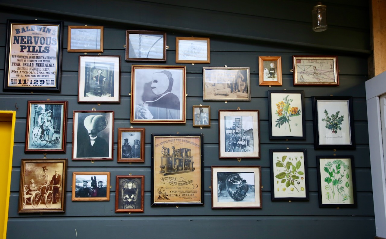 We watch as two guys take a quick dip in the ocean, which at its warmest in May is 55ºF, and pass two women who might have the same idea. Back up the hill, I compliment a woman on her cute socks and the couple notices we’re not from here, but neither are they. These travelers are visiting from Toronto and appreciating the few degrees of warmer weather and seeing another country. The return walk to the car is just as charming and then we go inside the cafe where we take a look at their wares in the back, the curved domino set out for use, and the wall of celebrity photos aka every dog that’s ever come in.