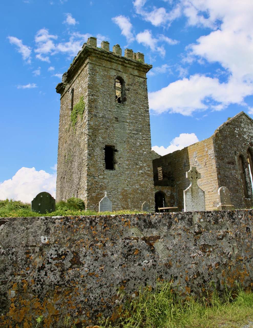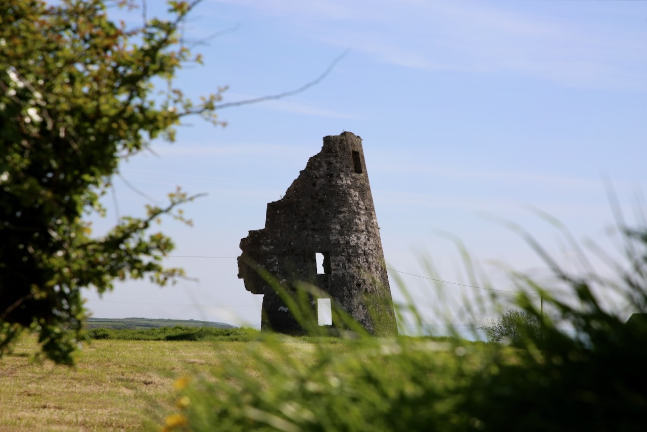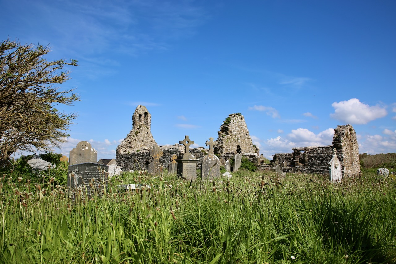 We take the forested trail back to the car and unknowingly pass Saltmills Mass Rock — a place where an altar stone was used for Catholic Mass during the mid-17th century. I only recognize it by the boat ruins on the beach. Our next stop is just a few minutes up the road and has a lady eyeing us as we parked in front of her house, as she’s leaving, to walk back and get a better picture of the tower ruins in her yard. Without unexpected house guests, the lady is on her way and we stop at St. Dubhán’s (translates to fishing hook) Church where a small wooden church was built by the Welsh saint in the 5th century.