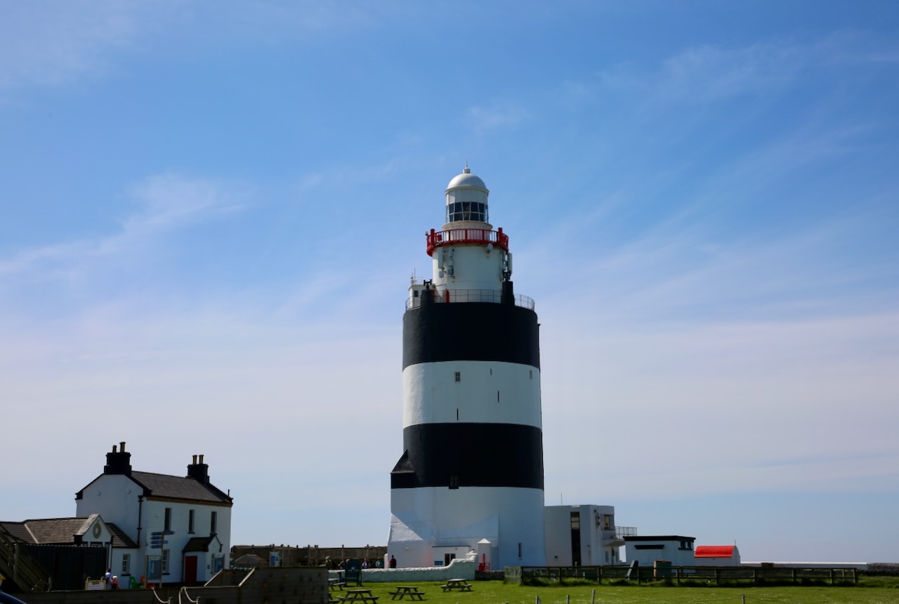 Dubhán’s father founded the St. Brecaun’s Church just 3 km away. The Normans built a stone church on the site 600 years later and Sir William Marshal built Hook Lighthouse (one of the top four oldest in the world) over the monks’ beacon. The tower is four stories high and the walls are four meters thick with 115 steps to the top that had to be constantly climbed with buckets of coal to keep the signal lit. A coal-burning lantern was installed in 1671 by the first lightkeepers who replaced the monks. In 1791 came the whale-oil lantern which was upgraded to gas lights in 1871 that led to paraffin oil in 1911 when a mechanism had to be wound every 25 minutes by the keeper.