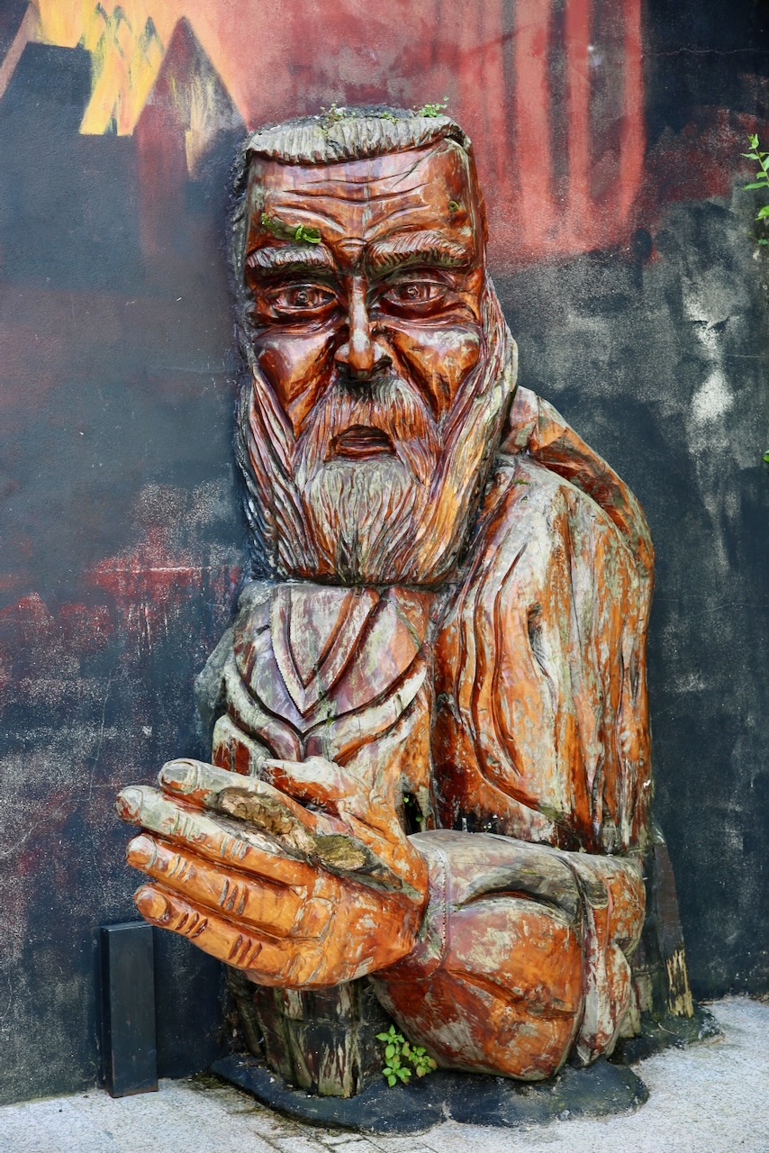 His statue is outside the Franciscan Friary also known as the French Church. The “Dragon Slayer” 23-meter sword, the world’s longest, outside the King of the Vikings virtual reality adventure, was carved from a single fallen tree by John Hayes and James Doyle in 2017. There is so much to see here, and our itinerary is of no help. Back to the tower, that has been a fortress, an arsenal, a coin mint, a prison, and now a museum; the only monument in Ireland named in honor of a Viking who founded the city in 914. There are a few things on display and the porcelain plate, silver pennies, and wine jug catch my eye as much as the stone steps, cloud-filled views, and large wooden door.