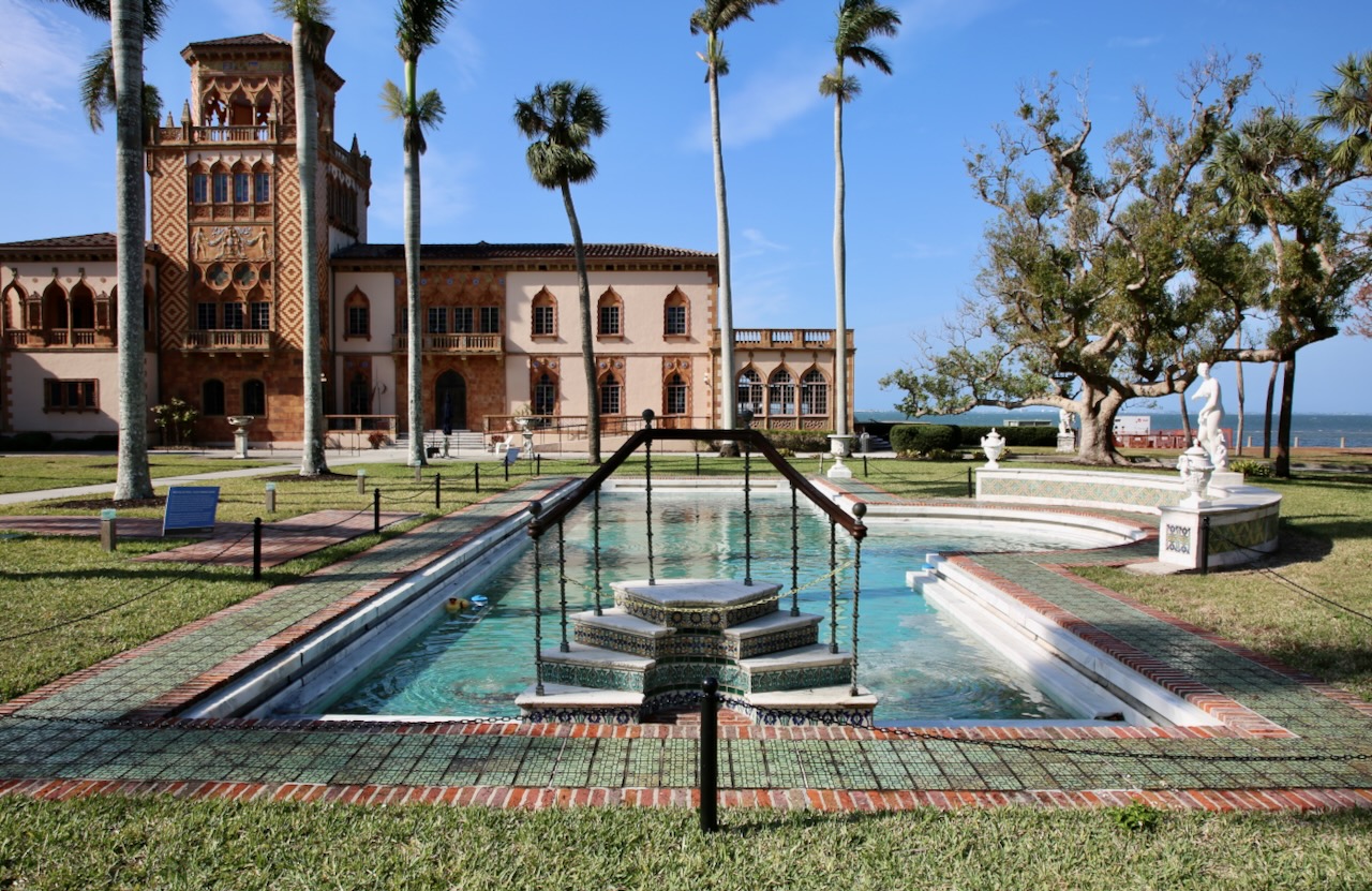 John and Mable were around between 1866 and 1936, making it to the ages of 70 and 54, respectively. They chose an excellent location for their winter home, completed in 1926 after two years of construction on 56 rooms within 36,000 square feet. It’s a stunning piece of architecture from the outside, and I can appreciate leaving the interior a mystery until a later date. The reflecting pool is in a bit of disrepair, but new blue tiles are coming soon, so I’m sure that will only improve its appeal.