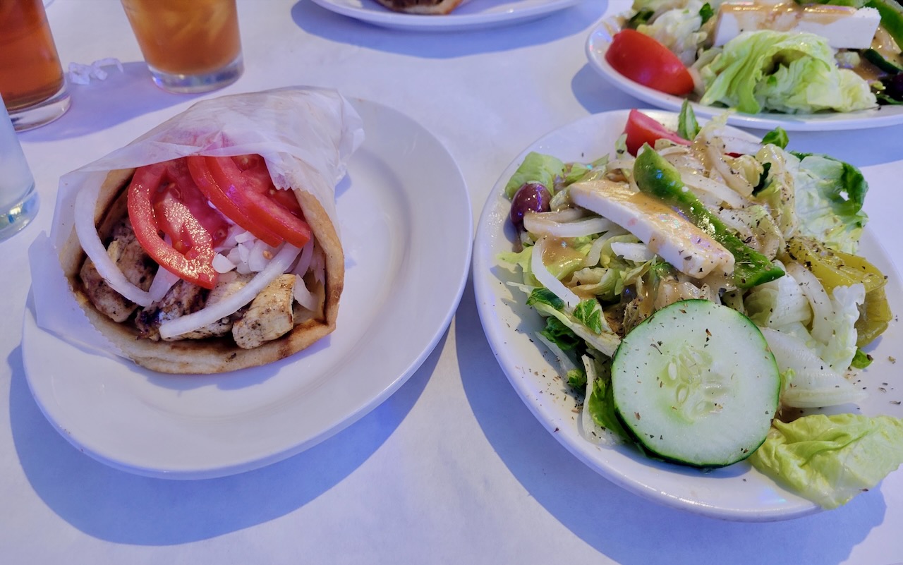 While we wait the 30-45 minutes, we stroll over to Wine At The Docks and add our home pins to their visitors’ map. I get the text, and soon we are seated with a waiter who likes to tell jokes. The restaurant serves two-for-one deals of tea and water, at least during rush hour, which I think other eateries should take note of. After packing down our gullets, a plate of Greek salad and a gyro each, we need to trudge off some calories.