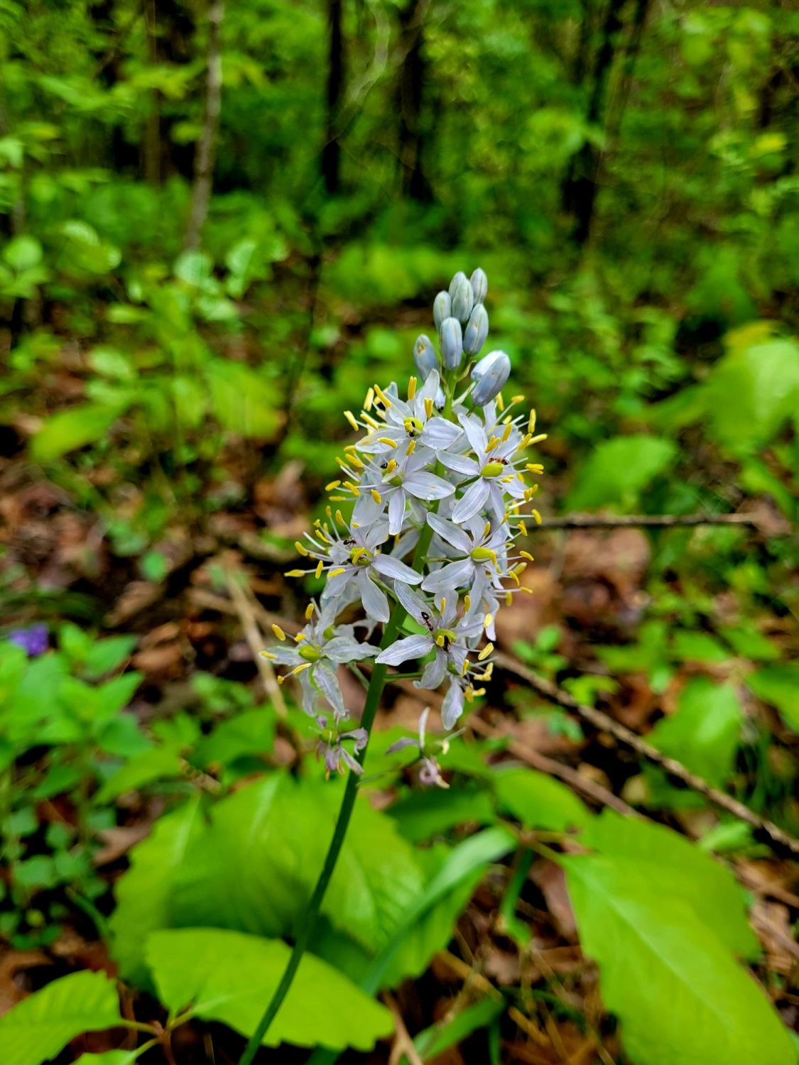 There are at least one hundred dead ladybugs on the window sill and one very excited puppy at the trailhead. Before reaching the 10,000-year-old cave, I spot a bunny in the bushes. Once below the 20 feet of accessible overhang (the rest fenced off to keep out collectors), I see an American robin chick peeking at me from its nest. We see a variety of purple flowers, British teeth mushrooms, and a Cookie Monster tree.