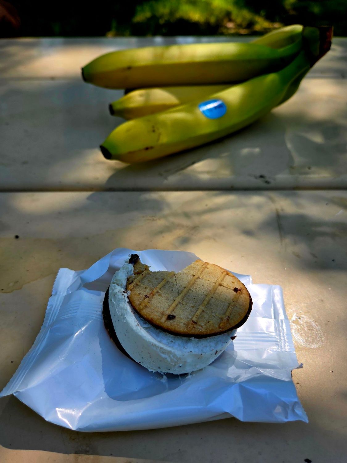 We are grateful for the shaded area and take another break in the high heat of the day since we don’t know what’s around the next turn or hill. We have about a mile to go until our planned stop at Mt. Laguna when I start getting snacky. Eric, our first trail angel, will satisfy that need before we reach our spot at the other end of the campground. We join him at a table for two Tillamook ice-cream sandwiches (vanilla and chocolate), two pieces of homemade brownies, a banana, and various electrolyte drink flavors.