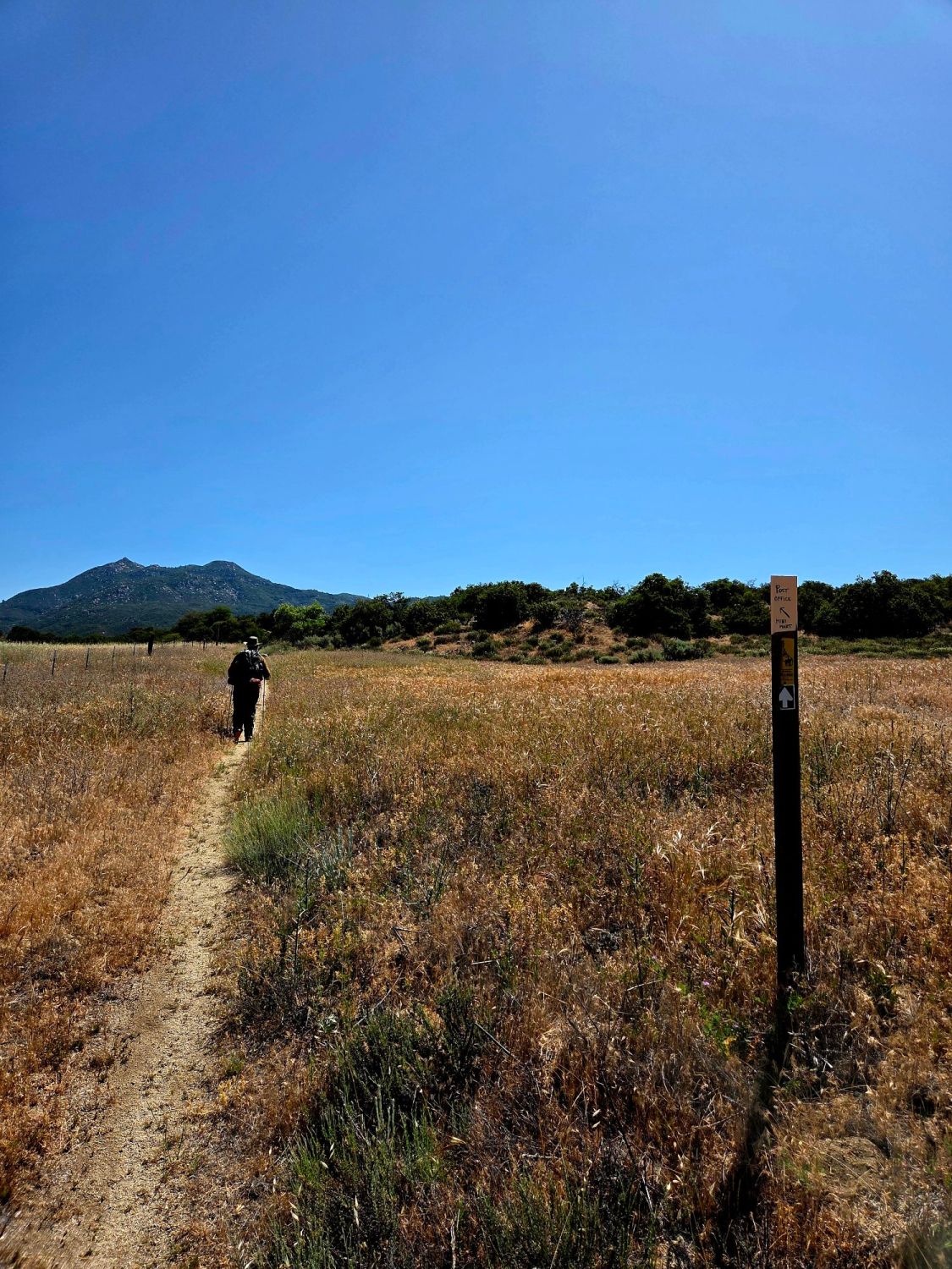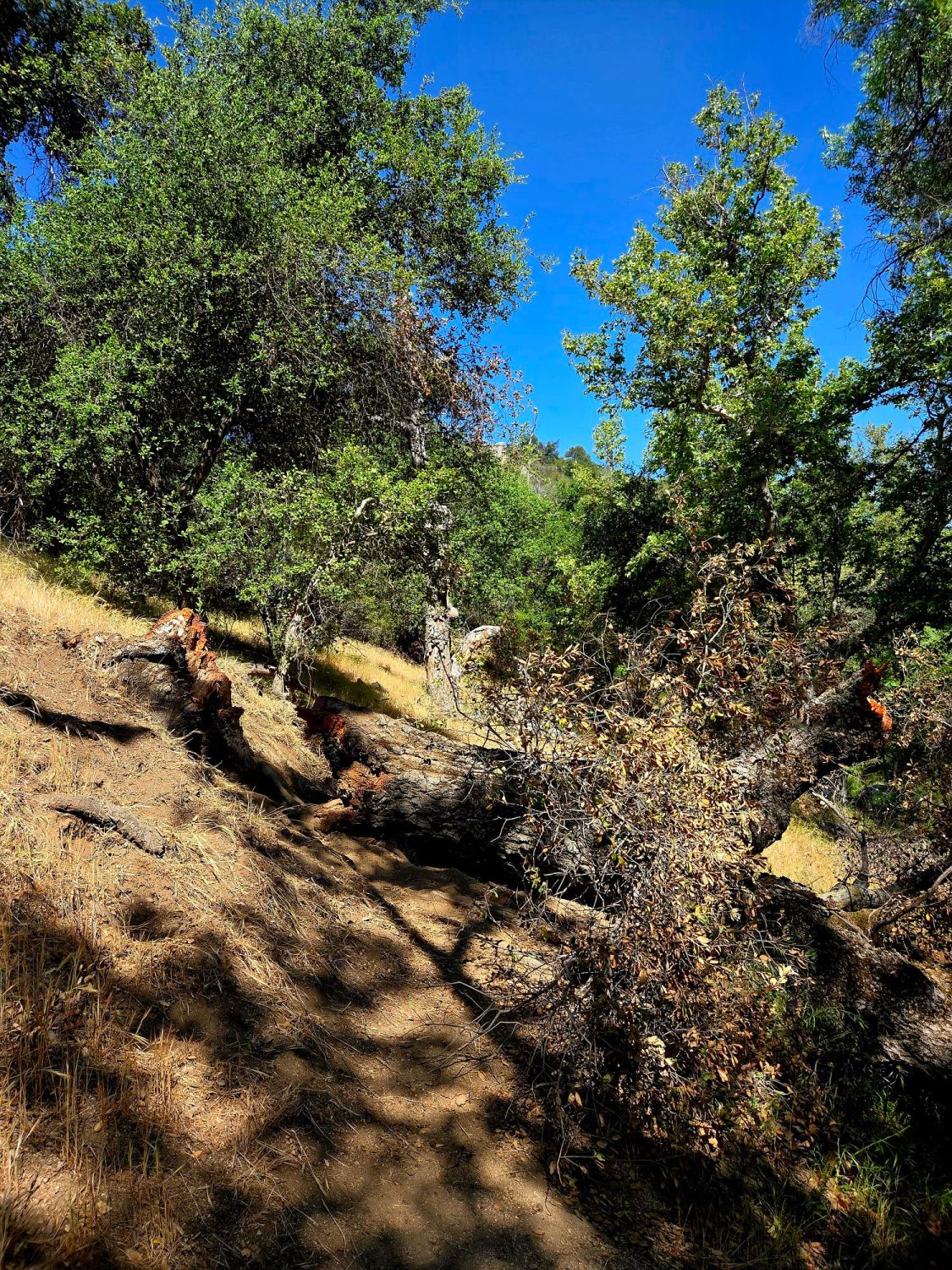 We are three miles from Eagle Rock, a popular waypoint on the PCT around mile 106 when we wake. We get to pass under shade, by cows, and through a meadow. We climb over our first downed tree, listen to the creek, and close the gates behind us as we go. Sometimes Caleb can’t hear me, but has no problem with the baby kangaroo mouse yelling for its mom.