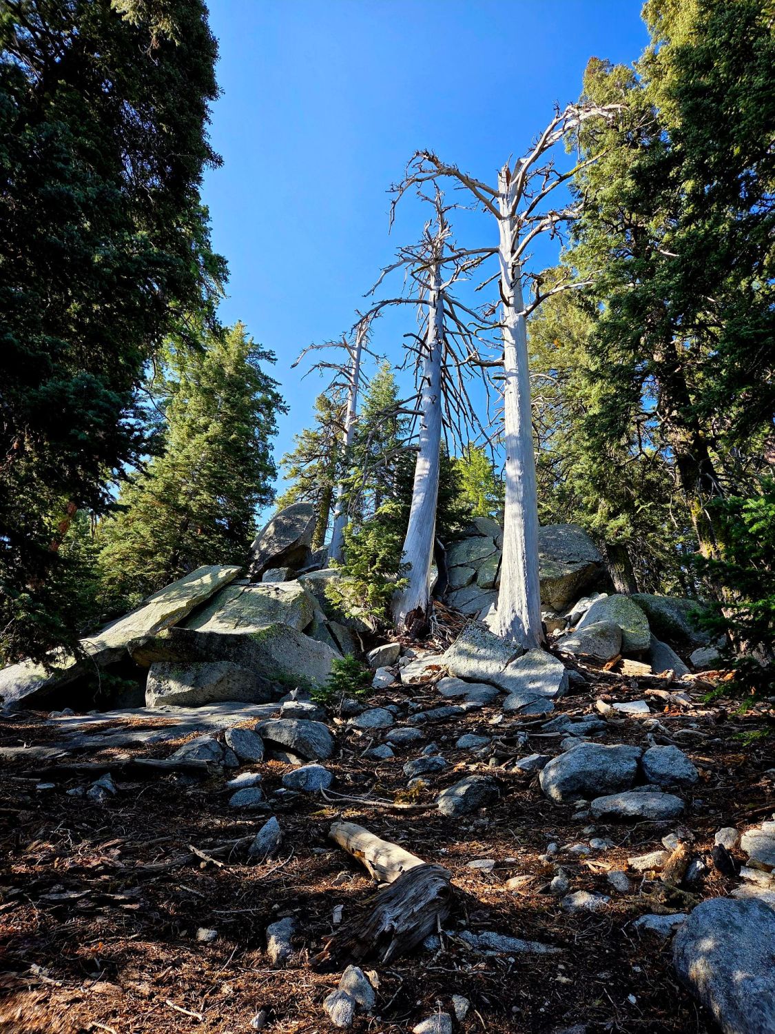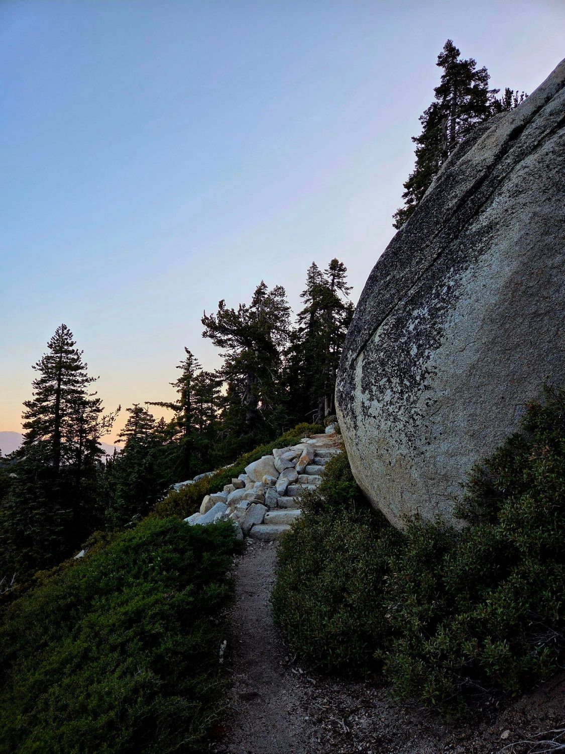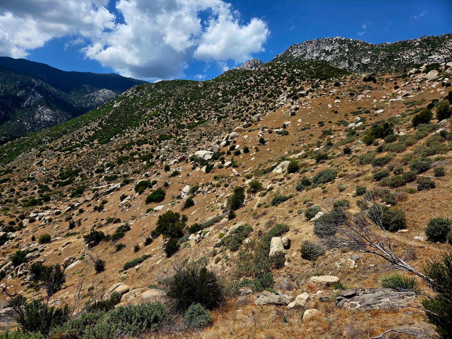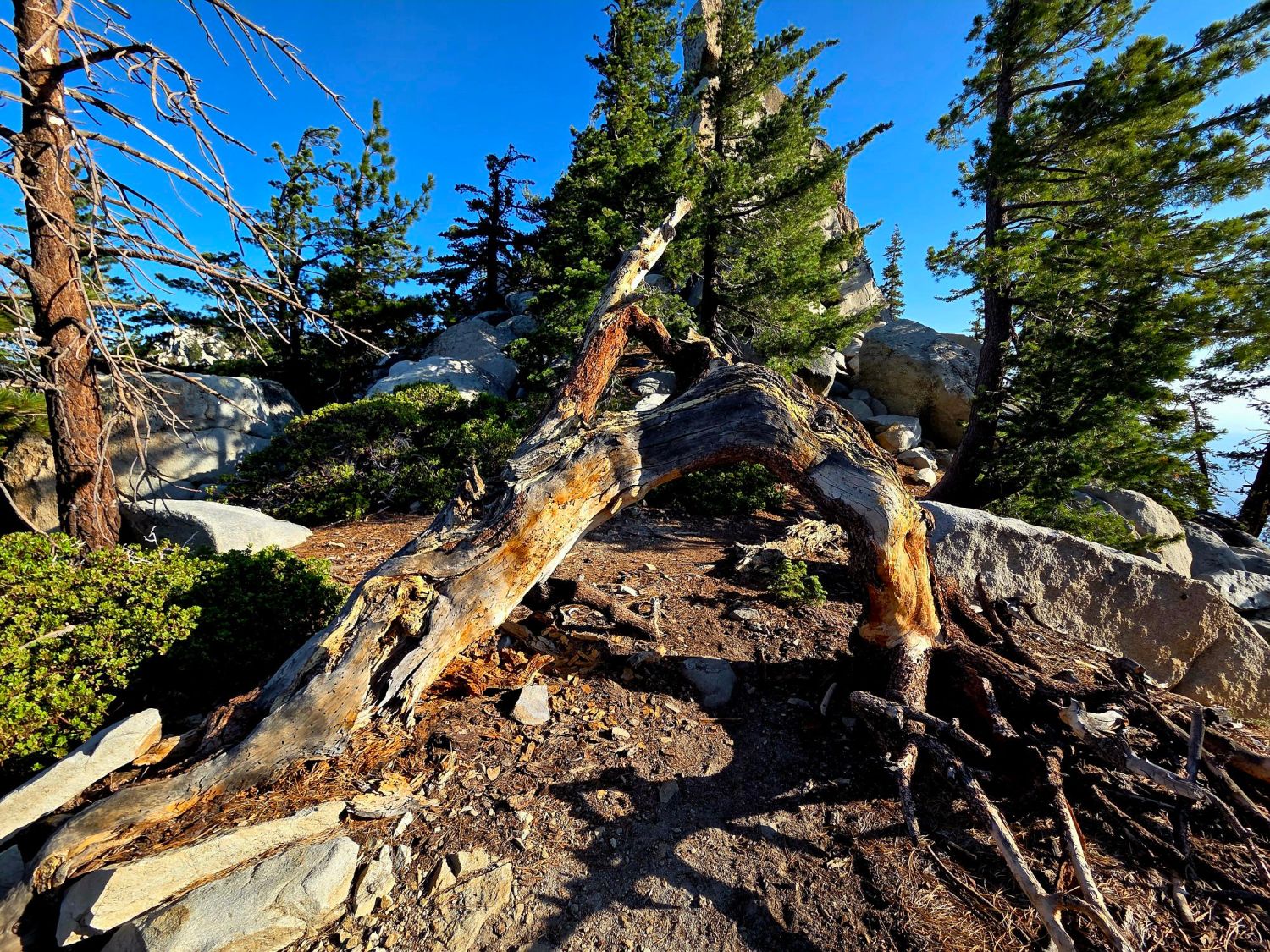 We are seemingly making good time among the manzanitas and pines that provide shade while looking out at the desert below, which is our destination for the day. We passed a tree that was hollowed out and two rocks – one looked like a dinosaur back, and the other like the smiling shark from Finding Nemo, Bruce. We come across a pine cone as big as Ravi’s head and let his youth carry him in front of us again.