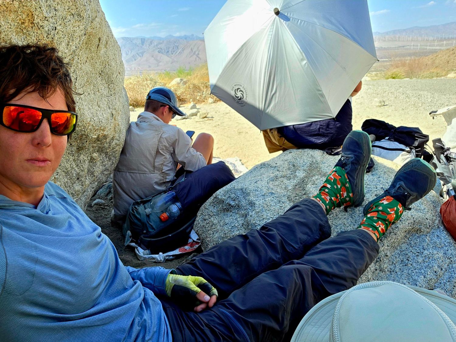 Out of the group, I had the most water, so they rushed to the next source – a rock with shade for four. I collapse in the dirt on two sets of trekking poles in the sun and am quickly offered an umbrella and a bag of water (thanks, Rachel), but Gert helps me up into the shade on the other side. We arrived after 4pm and Ravi and Kaito were already or still there. I have signal and let Caleb know I will be awhile.