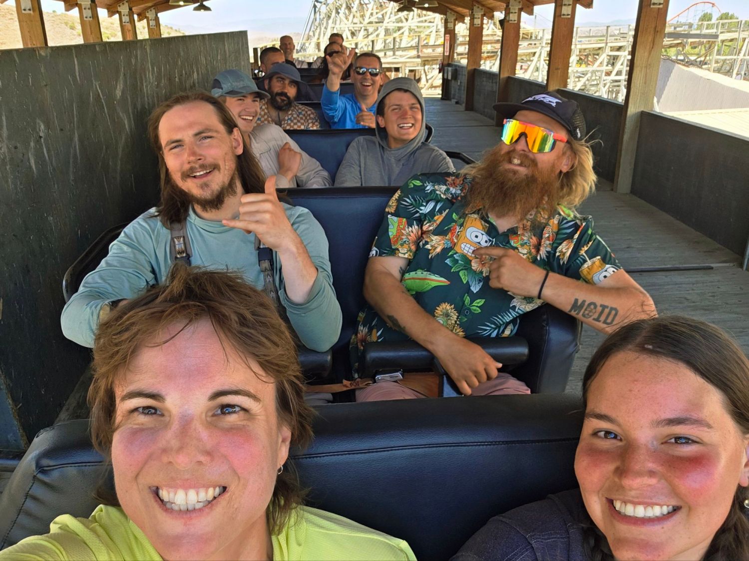 Our next choice is Apocalypse, a wooden coaster that flies over the ride-loading area. The speakers along the line are making noises that Rachel tells Ravi are working if he’s scared. It was a fun ride and we’re all still having a good time. This is the largest group, outside of high school, that I’ve ever been to a park with. It’s lunchtime when we get in line for West Coast Racers, so half the group goes to find food while we think it’ll only take 15 minutes.