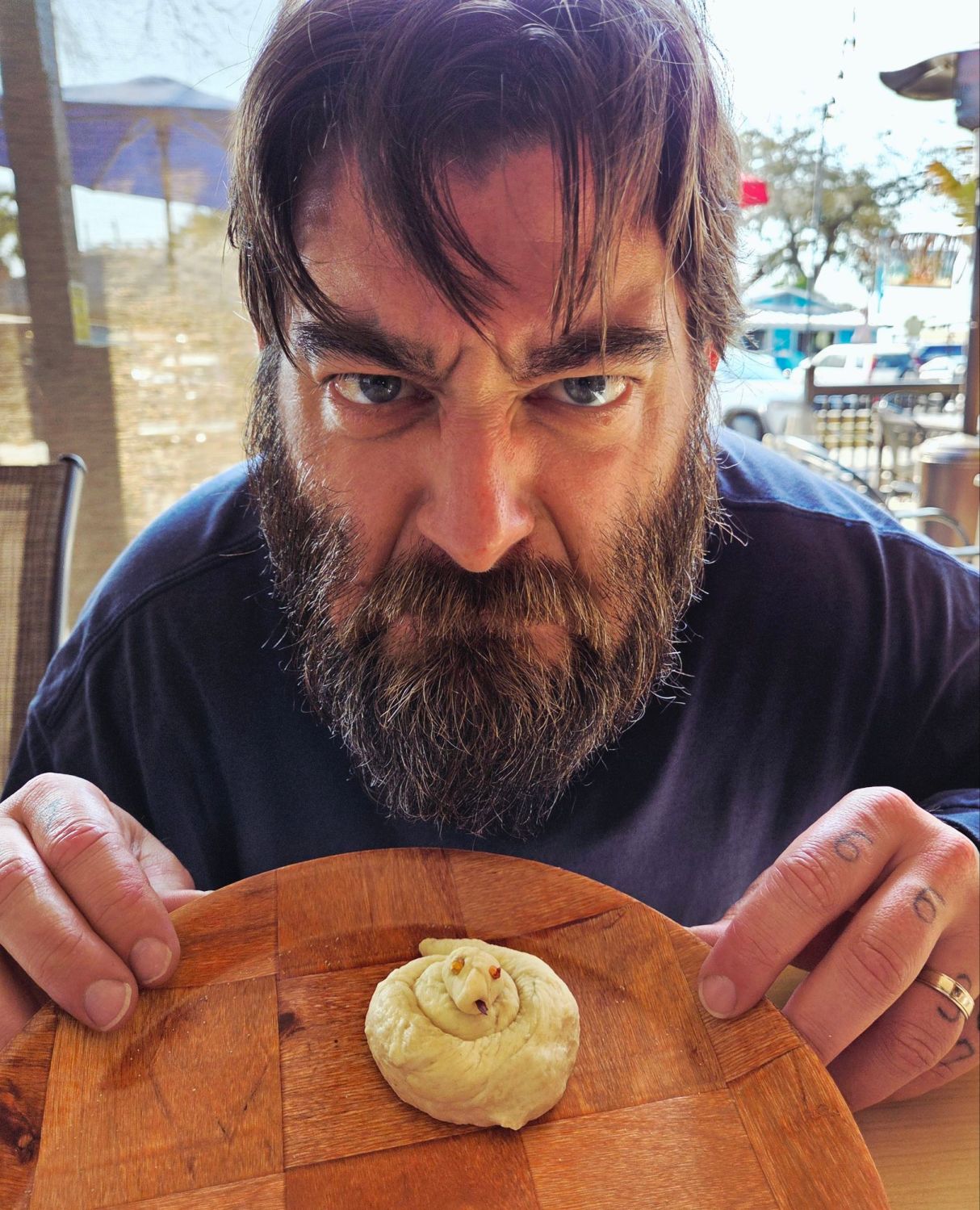 Caleb and Mr. Slithers at Fireside Pizza