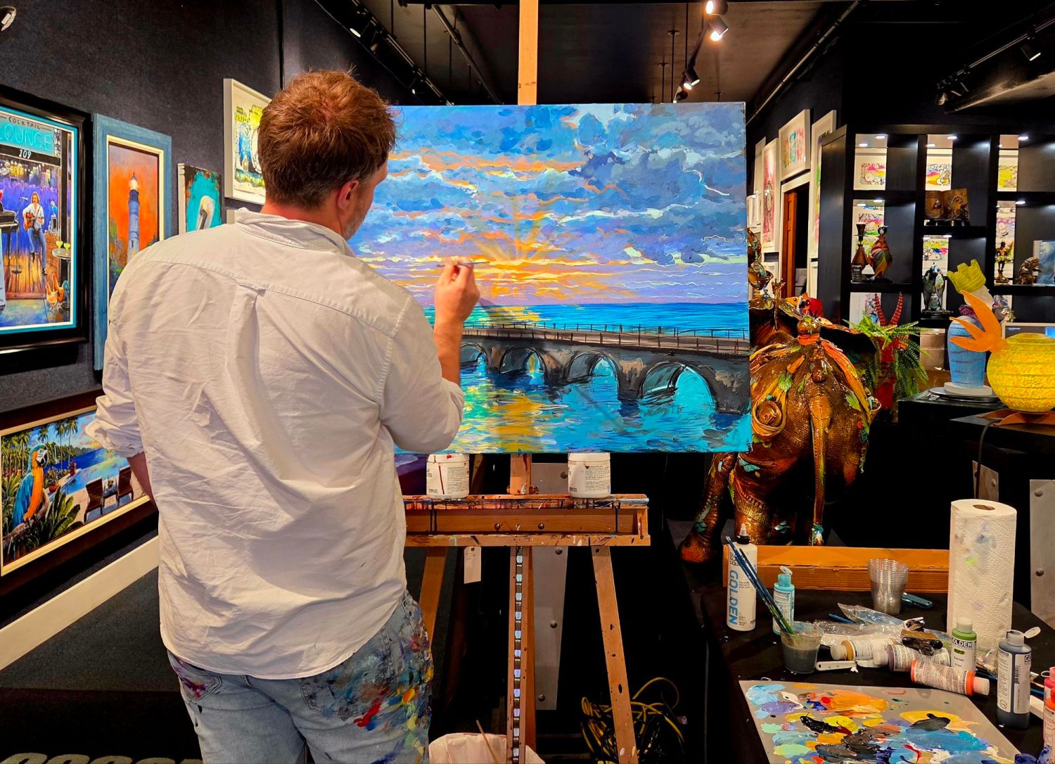We scrub the pollen out of the car’s crevices and order a car cover. We take a trip to Key West, which is another post. My blog no longer supports the pink and gray background, so I changed to blue and yellow. We have dinner at Fireside Pizza, and Caleb plays with some dough, like the two kids at the table by us. He makes Gumby and Mr. Slithers while another kid is being told to read aloud. Sue invites me in to see the painting of her dog, Sugar, done by Sarah, and to play with the pup for a while.