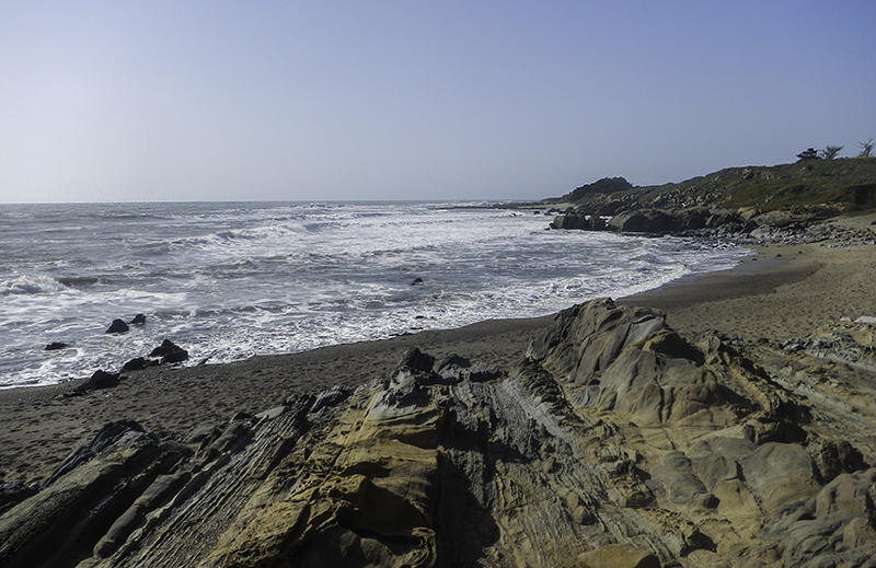 With wet painting in hand I’m ready to leave the crowded walkway and get somewhere less populated. We head south on Hwy 1 looking for camping, but stopping as often as possible to see the waves, flowers, cliffs, rocks – to stand on and others to hold in my hand, and colorful shells that look weathered. We stop at the Pigeon Point Lighthouse Hostel – a great place by the sea, with hot tub, but we won’t be staying tonight.