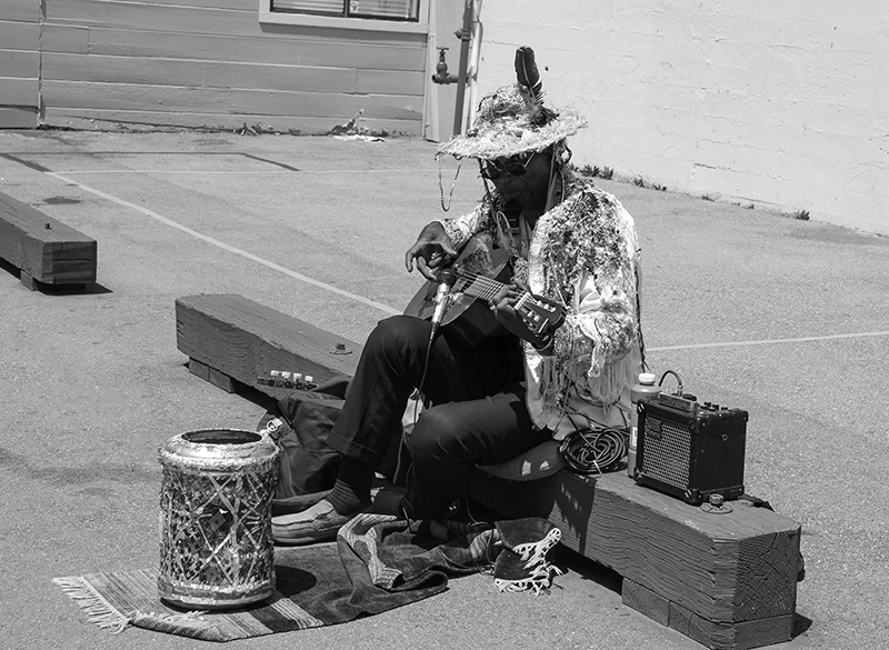 From there, we drive down to the famous Fisherman’s Wharf, and find parking again, this time for $18. We walk past the balloon artist, the silver men with boomboxes, and the man sitting on a crate with a branch scaring people. Along the way are two-story tour buses, people on GoCar Tours, people selling clothes and food, tourists on the sidewalk, cyclists and skaters in the street, and old guys playing instruments and doing magic tricks.