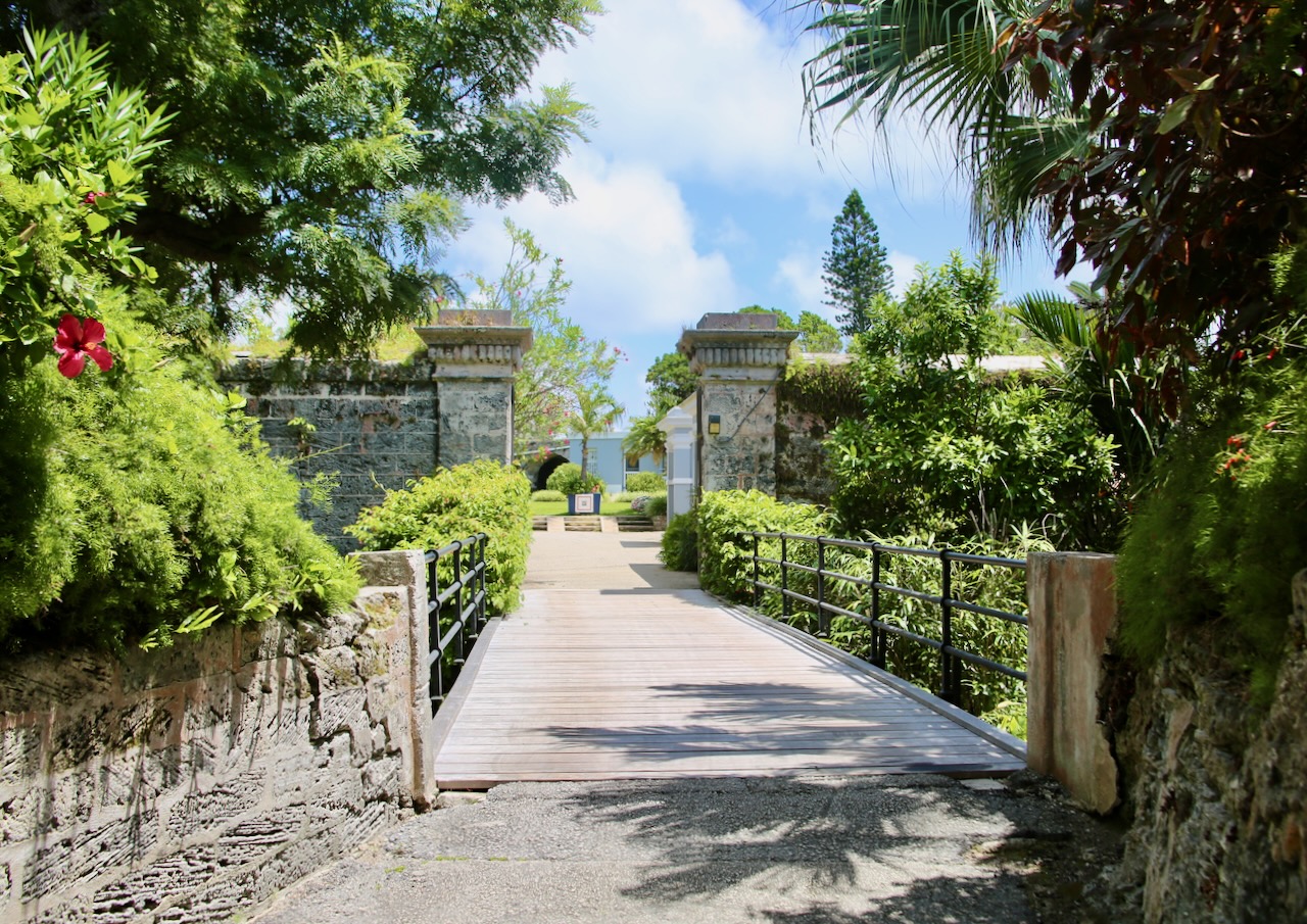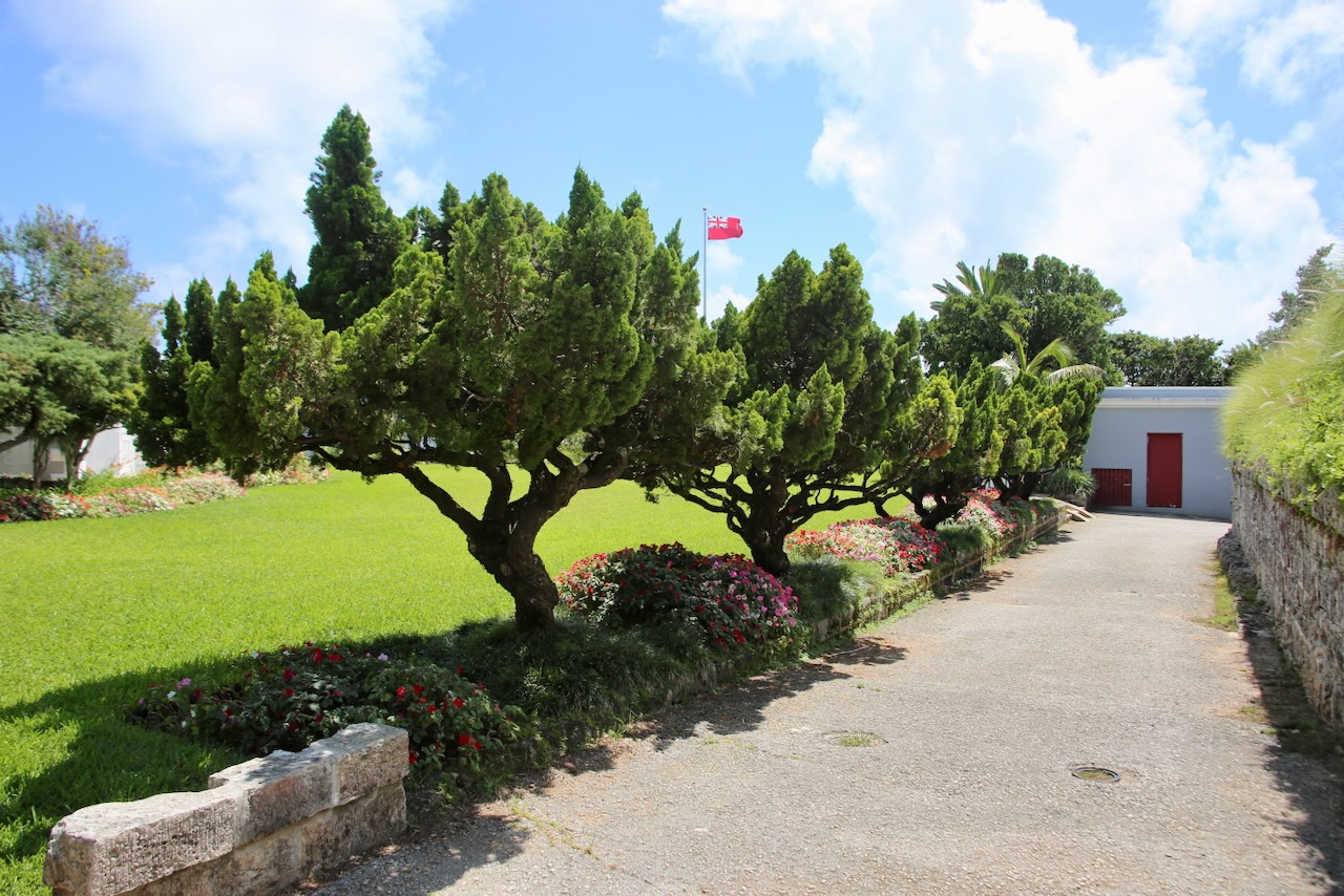 In the moat is greenery, shade, and wind, so I’m in no hurry to leave this garden that was started in the 1960s. I appreciate the sounds of the birds around me and notice a hen with her chicks nestled in some brown leaves. I explore the wet-bricked tunnels with roots reaching over the rocks for any moisture they can find. Back in the sun, there are bright flowers, manicured lawns, and the oldest self-governing overseas territory’s flag waving proudly over the fort.