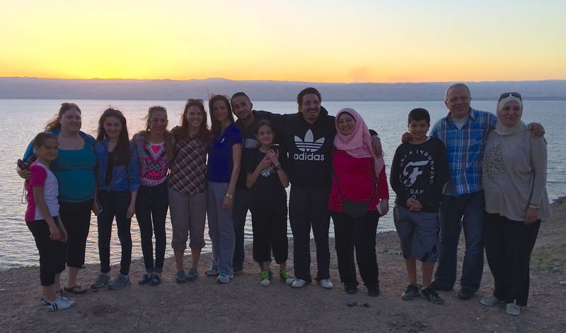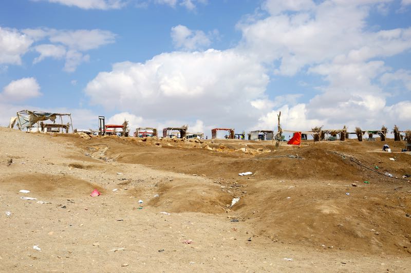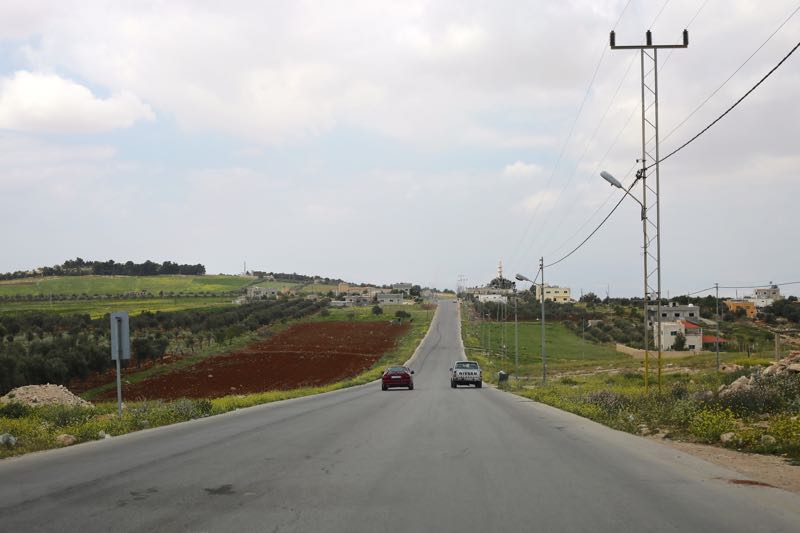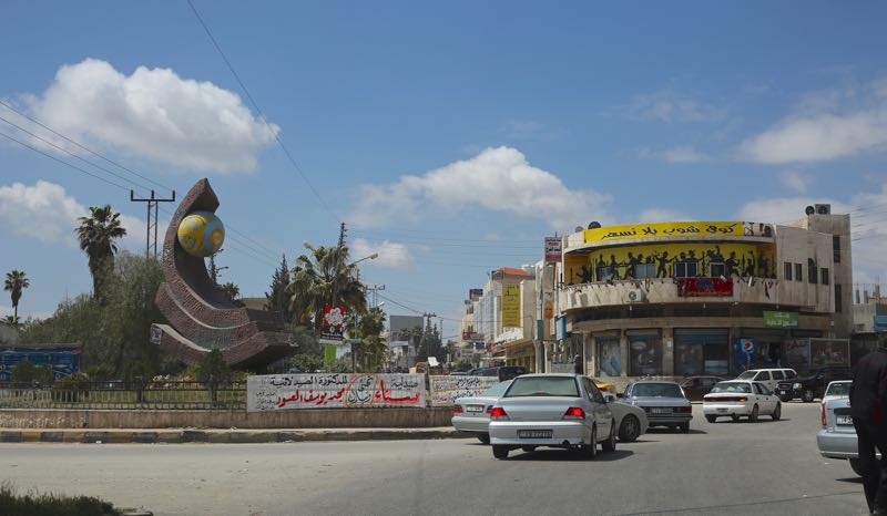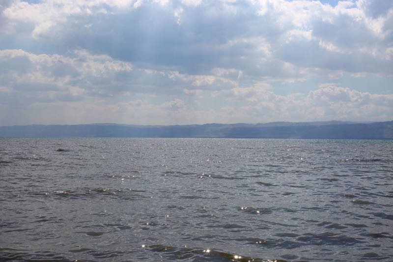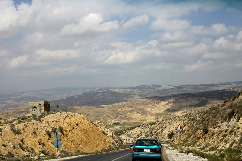 We paid 1 JD for a long shawarma with fries, tomatoes, and cucumbers, eaten off a Sports Authority tray. The staff showed us the large in-ground pots outside where they cook 100 chickens at once and told us that a shawarma stick can hold 200 chickens. We thanked them and got back on the road – and watched the hills go from green to brown to lake – as if the grass had melted into a pool.