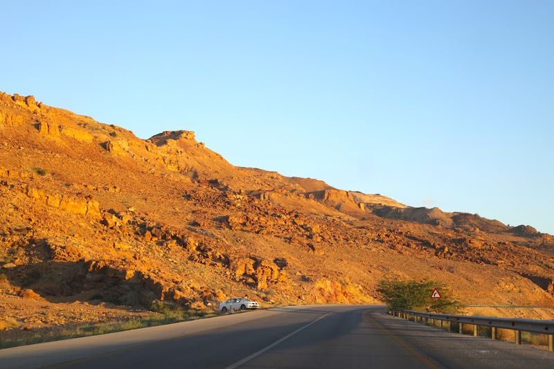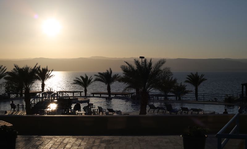 We first saw water on the horizon at 5:13pm and passed a sign for sea level at 5:20pm and thought we were getting closer to the Dead Sea – around the next bend, past the herd of goats, and the goodbye sign from the Municipality of Al Aghwar Al Janubiyya – and there’s just more road going along. I stopped on the shoulder for pictures of the sun on the water in front of us and the rocks behind us.